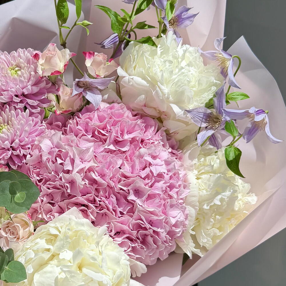 Eucalyptus - 2 Stk. Sprayrose - 3 Stk. Chrysanthemum - 2 Stk. Pfingstrosen - 3 Stk. Hortensien - 1 Stk. clementis - 3 Stk.
