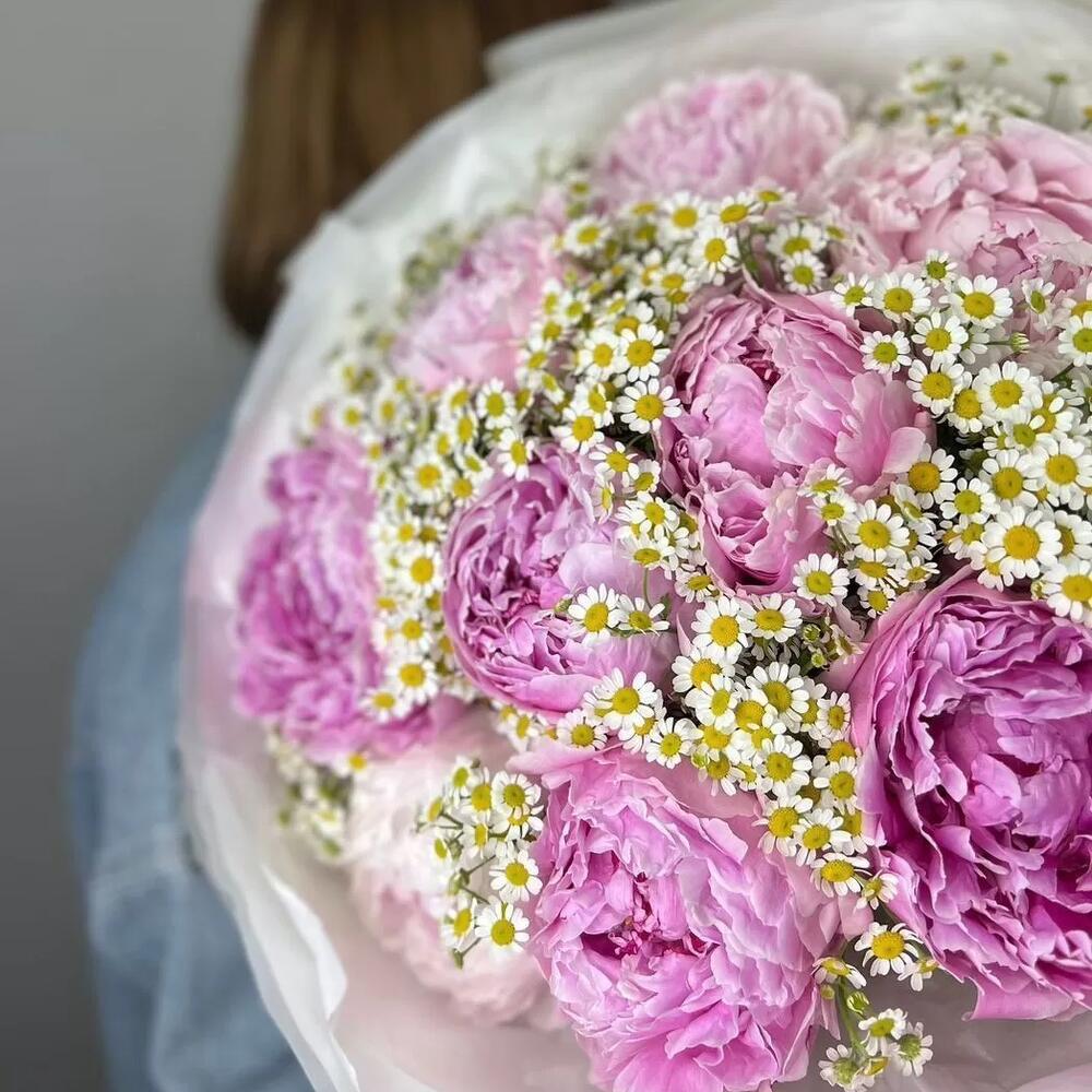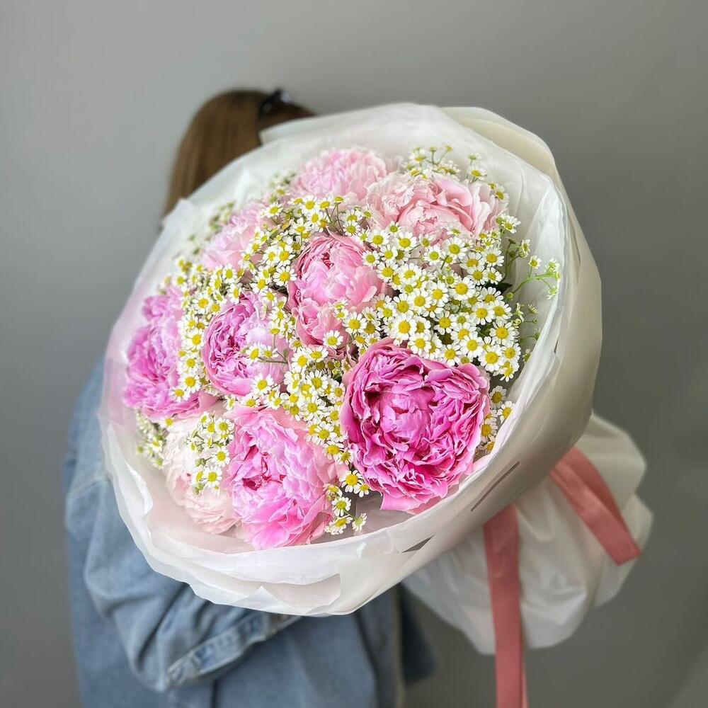 Букет из 9 пионов Sarah Bernhardt и ромашек Матрикария