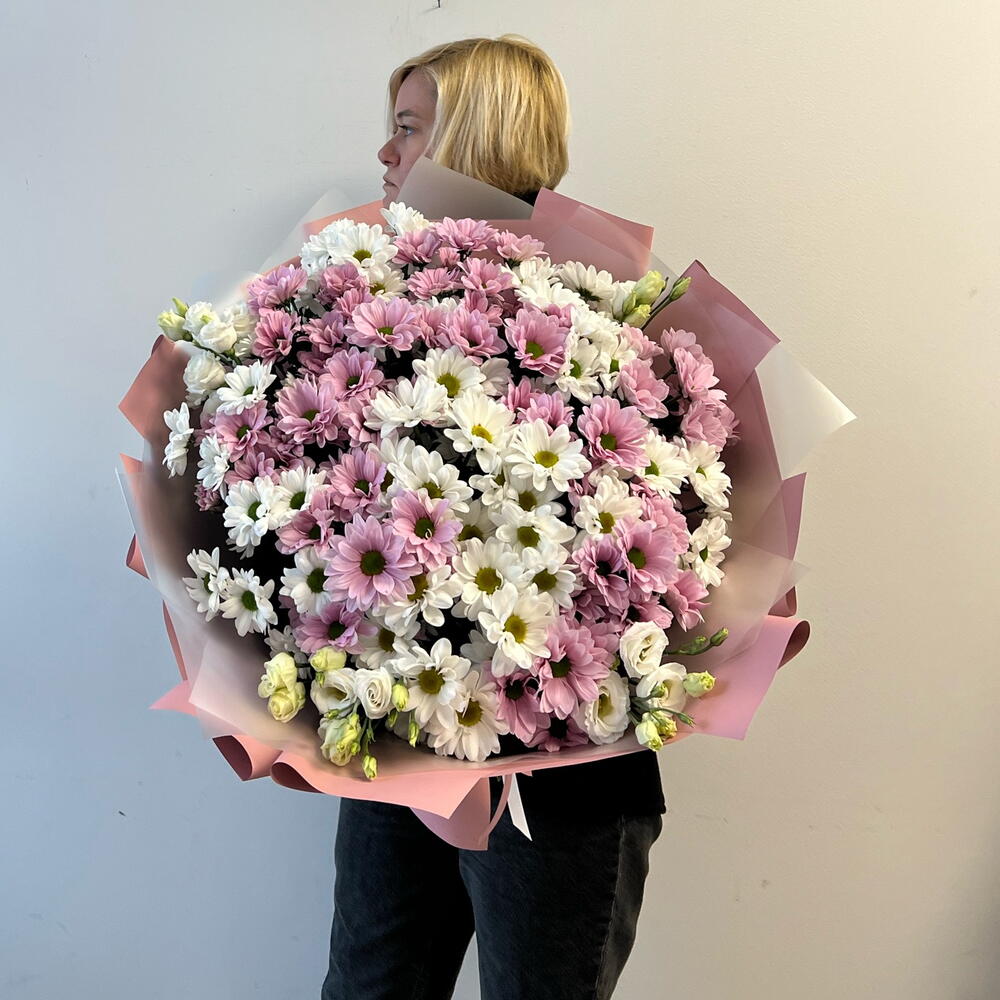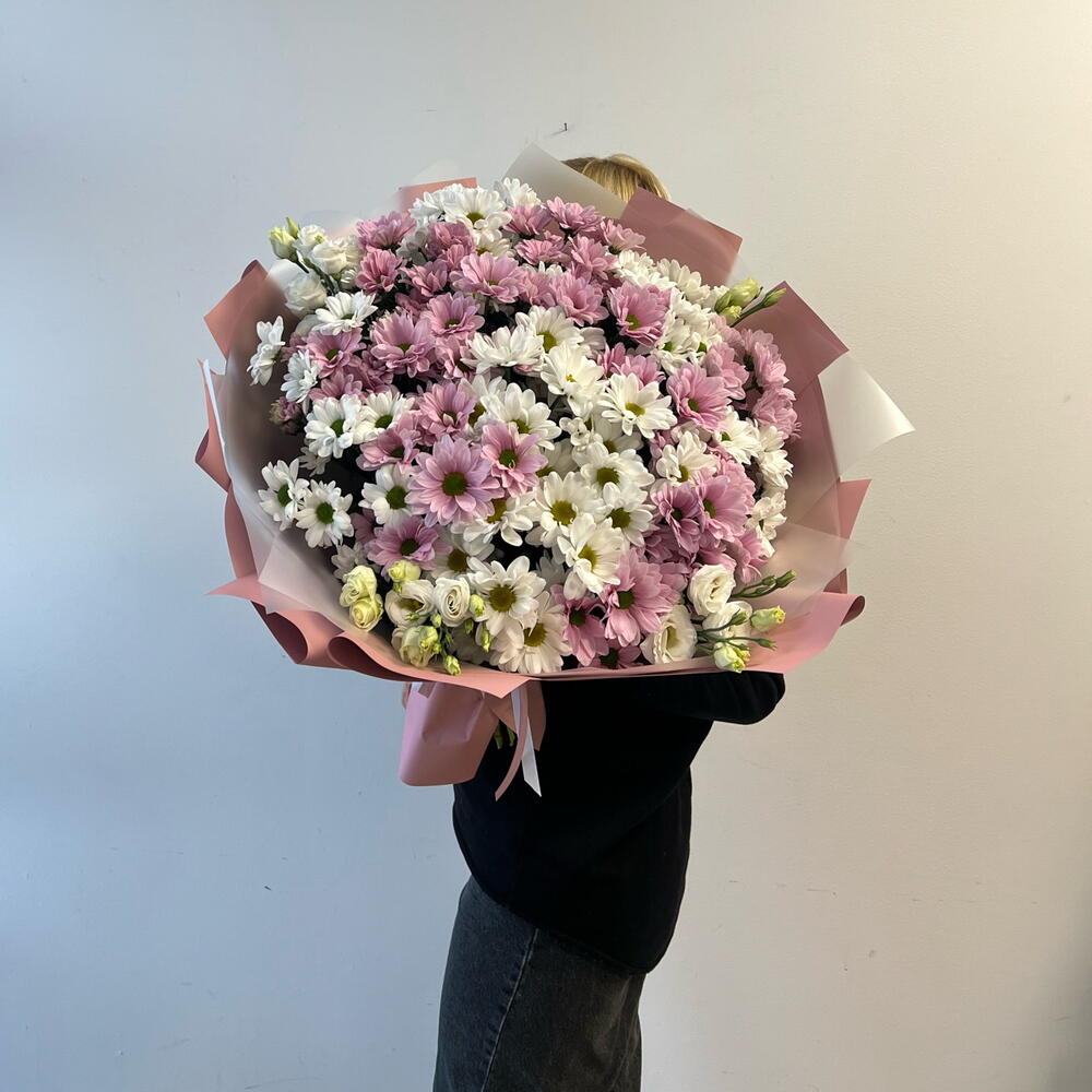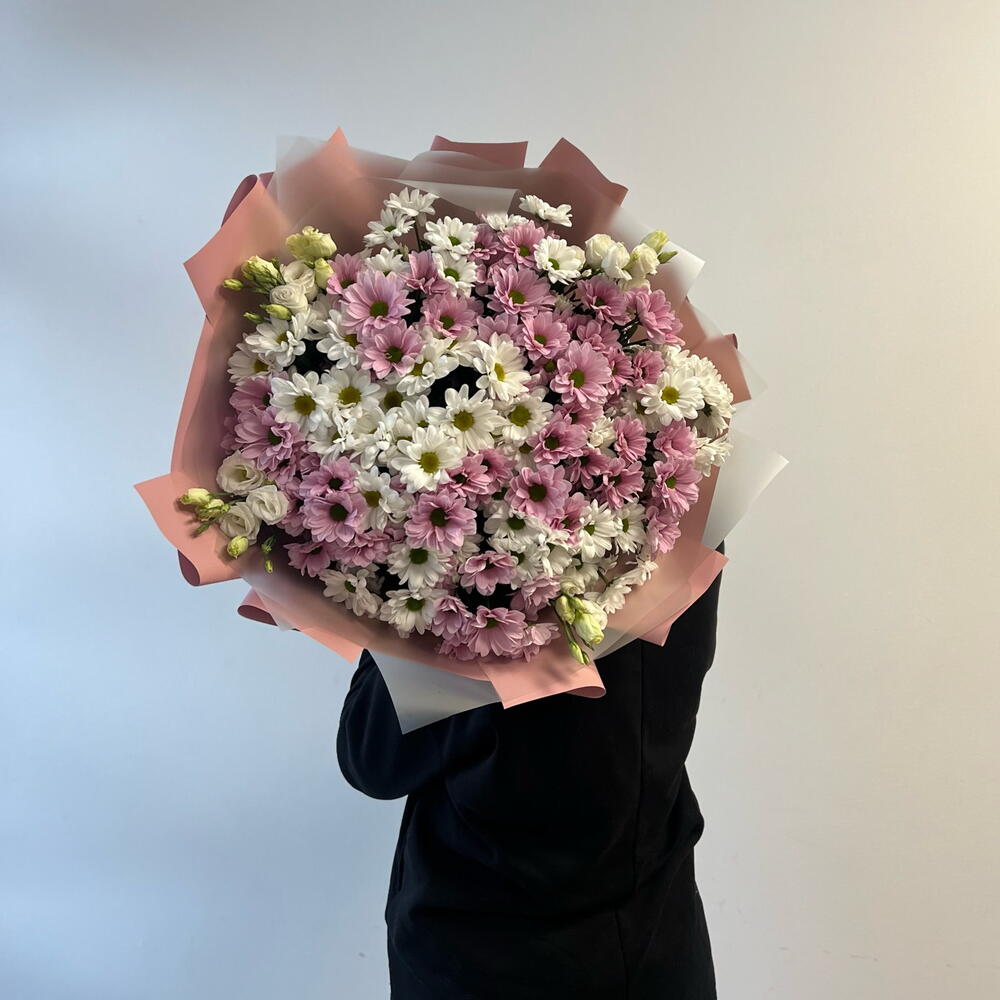 weiße Eustoma - 4 Stk. weiße Chrysantheme - 10 Stk. rosa Chrysantheme - 10 Stk.