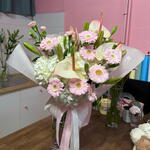 Gerbera - 8 Stk. Lilie - 5 Stk. Anthurium - 3 Stk. Hortensie - 4 Stk. Nelken - 4 Stk. dekoratives Papier - 1 Stk.