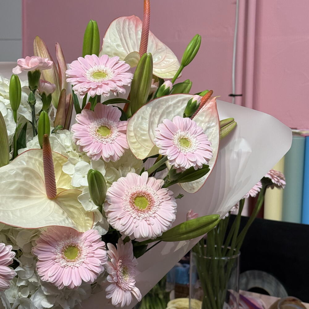 Gerbera - 8 Stk. Lilie - 5 Stk. Anthurium - 3 Stk. Hortensie - 4 Stk. Nelken - 4 Stk. dekoratives Papier - 1 Stk.