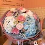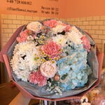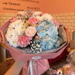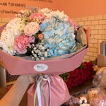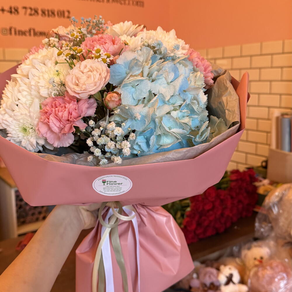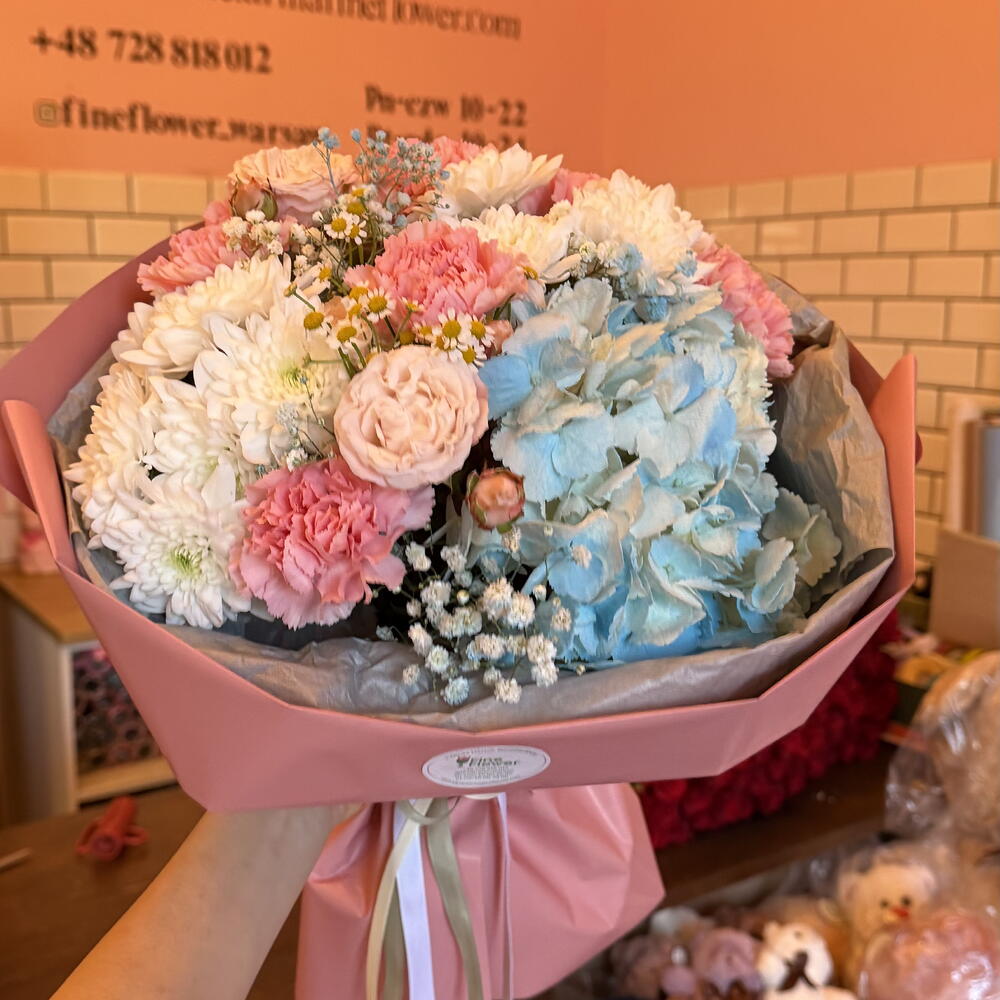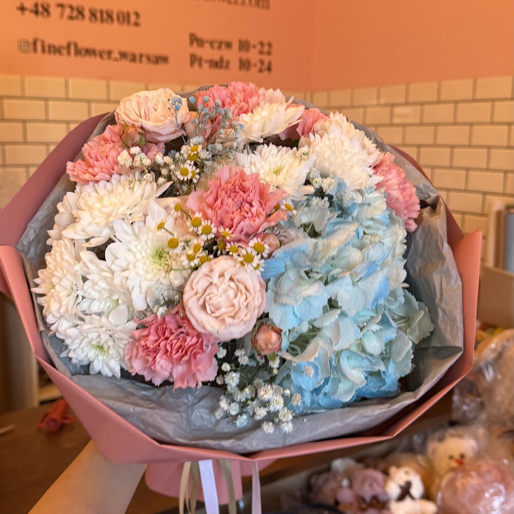 Hortensie - 1 Stk. Kamille - 1 Stk. Spray-Rose - 1 Stk. Nelke - 6 Stk. Gänseblümchen - 2 Stk. schleierkraut - 1 Stk.
