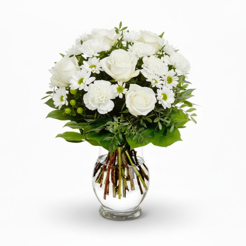 Blumige Ruhe – eine zarte Komposition aus weißen Rosen, Nelken und Gänseblümchen, die die Sinne beruhigt und eine Atmosphäre der Harmonie schafft. Die perfekte Wahl, wenn du Dankbarkeit, Mitgefühl oder einfach nur – Ruhe im Herzen ausdrücken möchtest. Ideal für jeden Anlass.