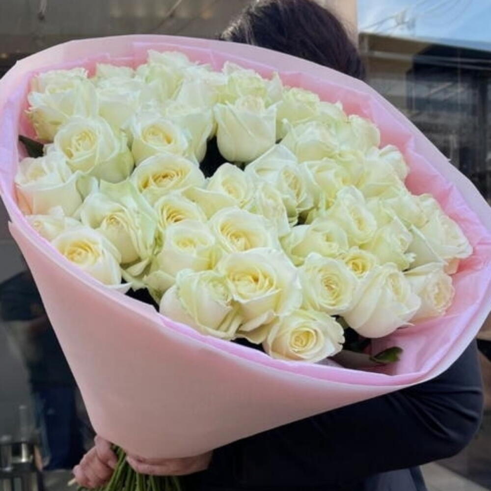 weiße Rosen - 50 Stk. Verpackung aus Floristenpapier - 6 Stk. Blumendünger - 1 Stk.
