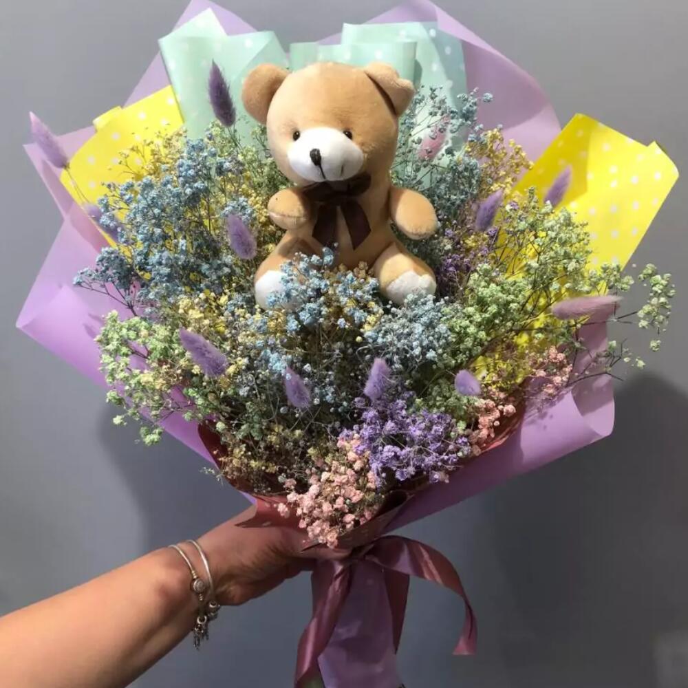 Teddybär - 1 Stk. buntes Schleierkraut - 7 Stk.