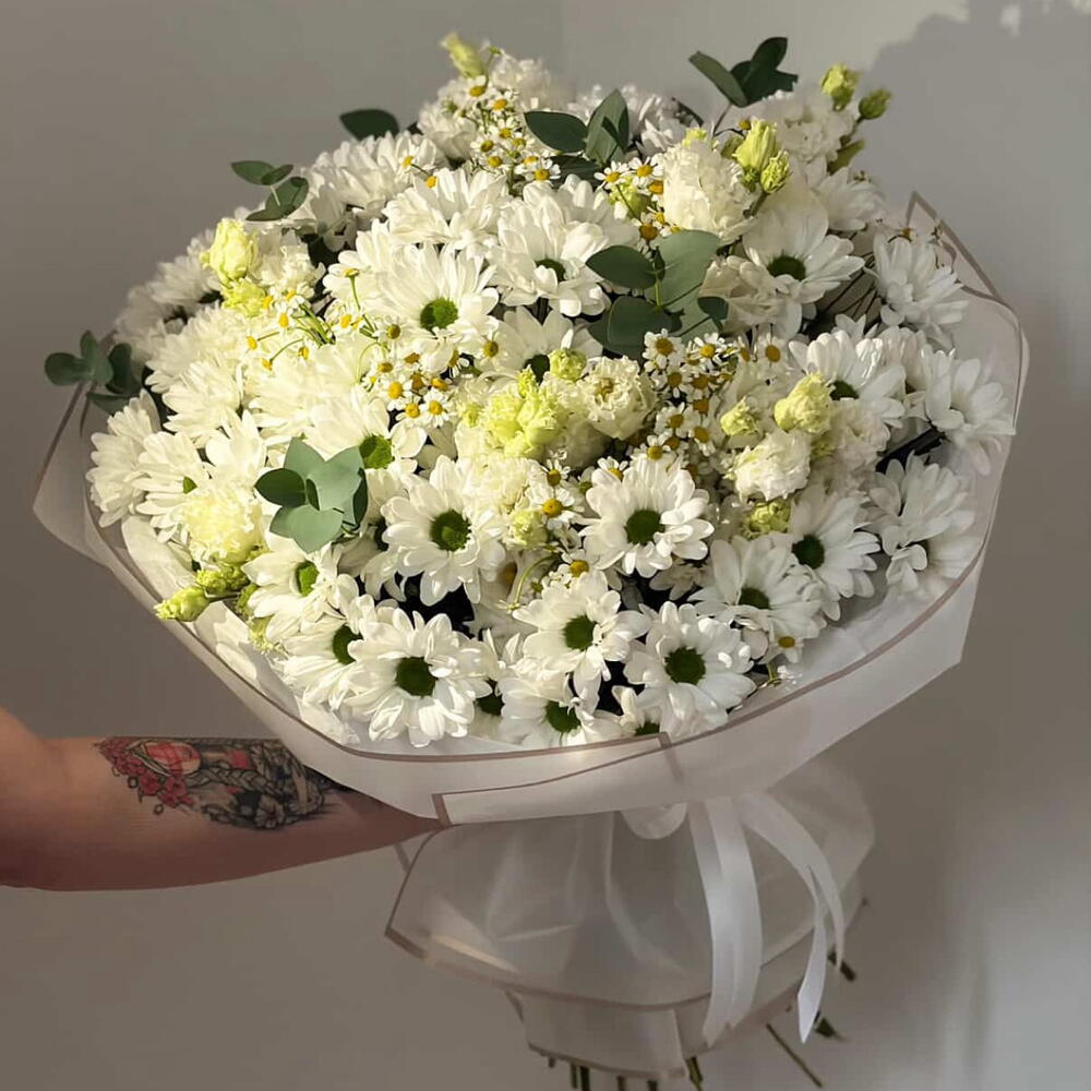 Eustoma - 7 Stk. Eucalyptus - 7 Stk. Chrysanthemum - 12 Stk. tanacetum - 6 Stk.