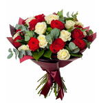 Eukalyptus - 5 Stk. rote Rose - 17 Stk. weiße Rose - 10 Stk. Dekorative Verpackung - 1 Stk.