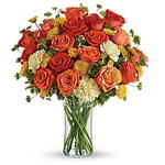 As warm and inviting as a day at the beach or summer sunrise, this invigorating arrangement of mouthwatering orange flowers is a gorgeous expression of your love or friendship. Dark orange, orange and coral roses are gathered with light yellow carnations, yellow button mums and fresh green bupleurum and pittosporum in a simple glass gathering vase. Orientation: All-Around SUBSTITUTION POLICY – Always deliver the freshest flowers! Please note the bouquet pictured reflects our original design. If the exact flowers or container in this arrangement are not available, our local florists will create a beautiful bouquet with the freshest available flowers.