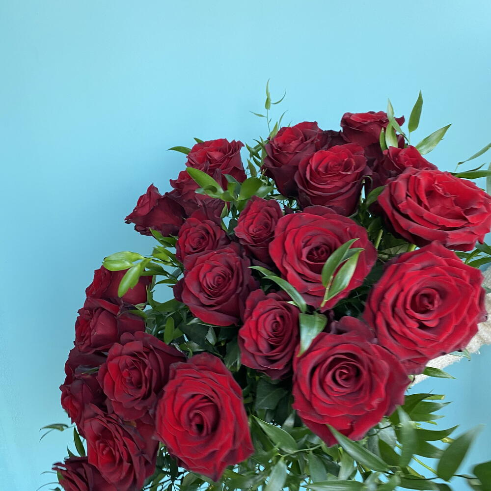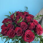 A classic bouquet of roses 24 red roses with 9 tied in green
