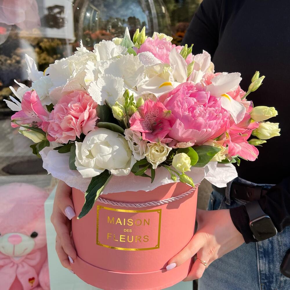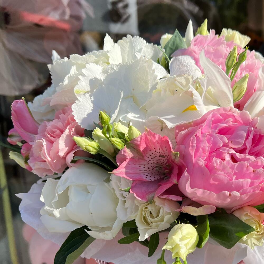 Hydrangea - 1 Stk. Alstroemeria - 1 Stk. Iris - 5 Stk. Lisianthus - 2 Stk. Pfingstrose - 5 Stk. dianthus - 3 Stk.