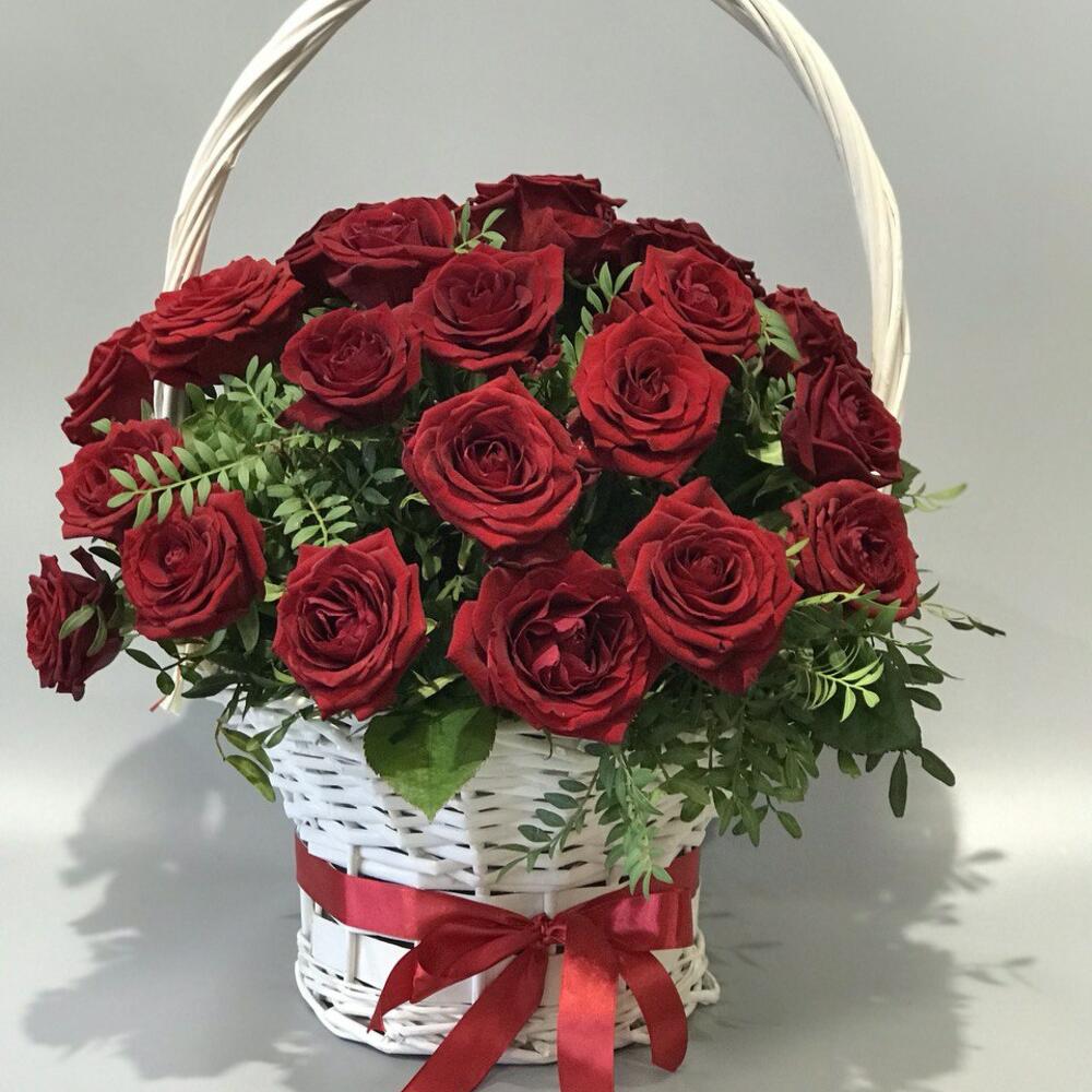 rote Rosen - 31 Stk. großer Korb - 1 Stk. Dekoratives Grün - 10 Stk.