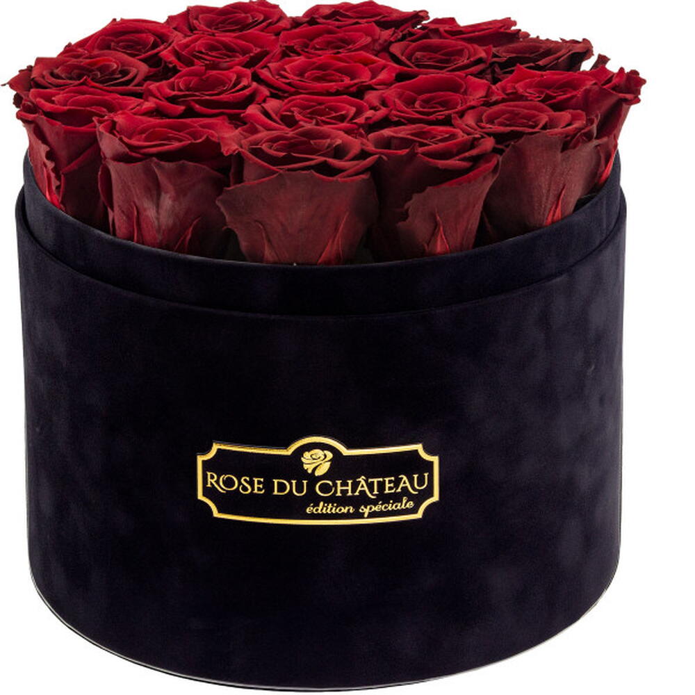 Rote ewige Rosen in einer großen schwarzen flockierten Box