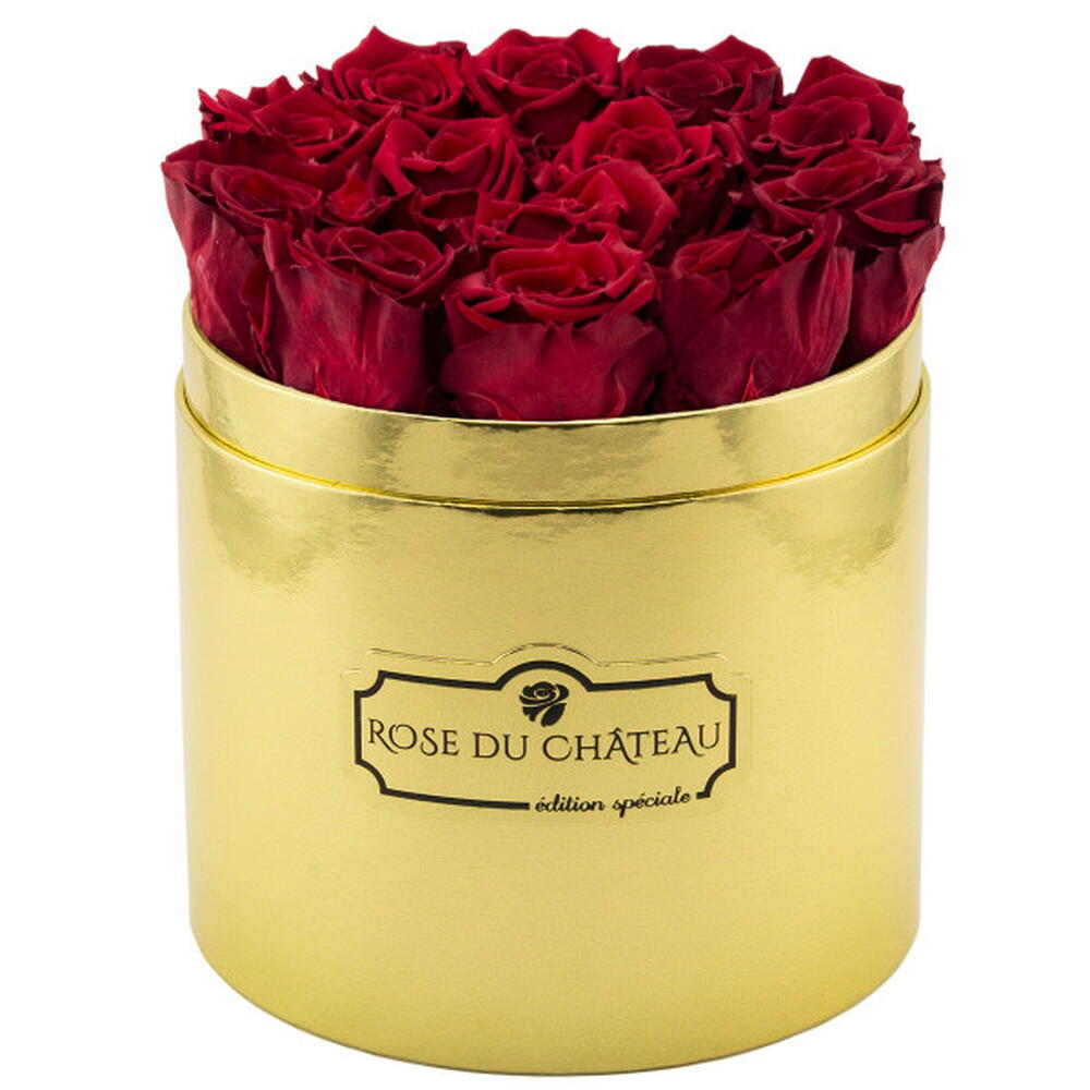 Romantische Extravaganz Wir präsentieren Ihnen eine weitere Neuheit in unserem Sortiment: eine goldene Blumenbox. Rote Rosen in einer goldenen Box ergeben ein romantisches und ausdrucksstarkes Arrangement. Dieses Set ist für selbstbewusste Menschen, die außergewöhnliche Farben zu schätzen wissen. Ewige Rosen sind leuchtende Blumen, die ihre Farbe und Form mindestens zwei Jahre lang behalten. Sie können sicher sein, dass dieses stilvolle Set viel länger Freude bereitet als ein herkömmlicher Blumenstrauß. Die rote Farbe der Rosen symbolisiert Liebe, Vertrauen, Schönheit und Mut. Anzahl der Rosen: ca. 13 (je nach Größe der Rosenköpfe) Durchmesser der Box: Ø 20 cm Wir verwenden eine der edelsten Sorten ewiger Rosen weltweit.