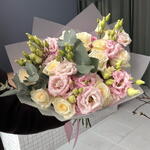 Zarter, frischer Strauß in pastellfarbenen Nuancen von puderrosa und vanilleweiß, durchbrochen von natürlichem Eukalyptusgrün. Zarte Eustomen und klassische Rosen bilden eine leichte, elegante Komposition mit romantischem Charakter. Morgendliche Harmonie verzaubert durch Ruhe, Natürlichkeit und zeitlose Ästhetik - ideal zum Geburtstag, als Dank, zu Glückwünschen oder als Ausdruck zärtlicher Gefühle ohne Anlass. 🌿🌸