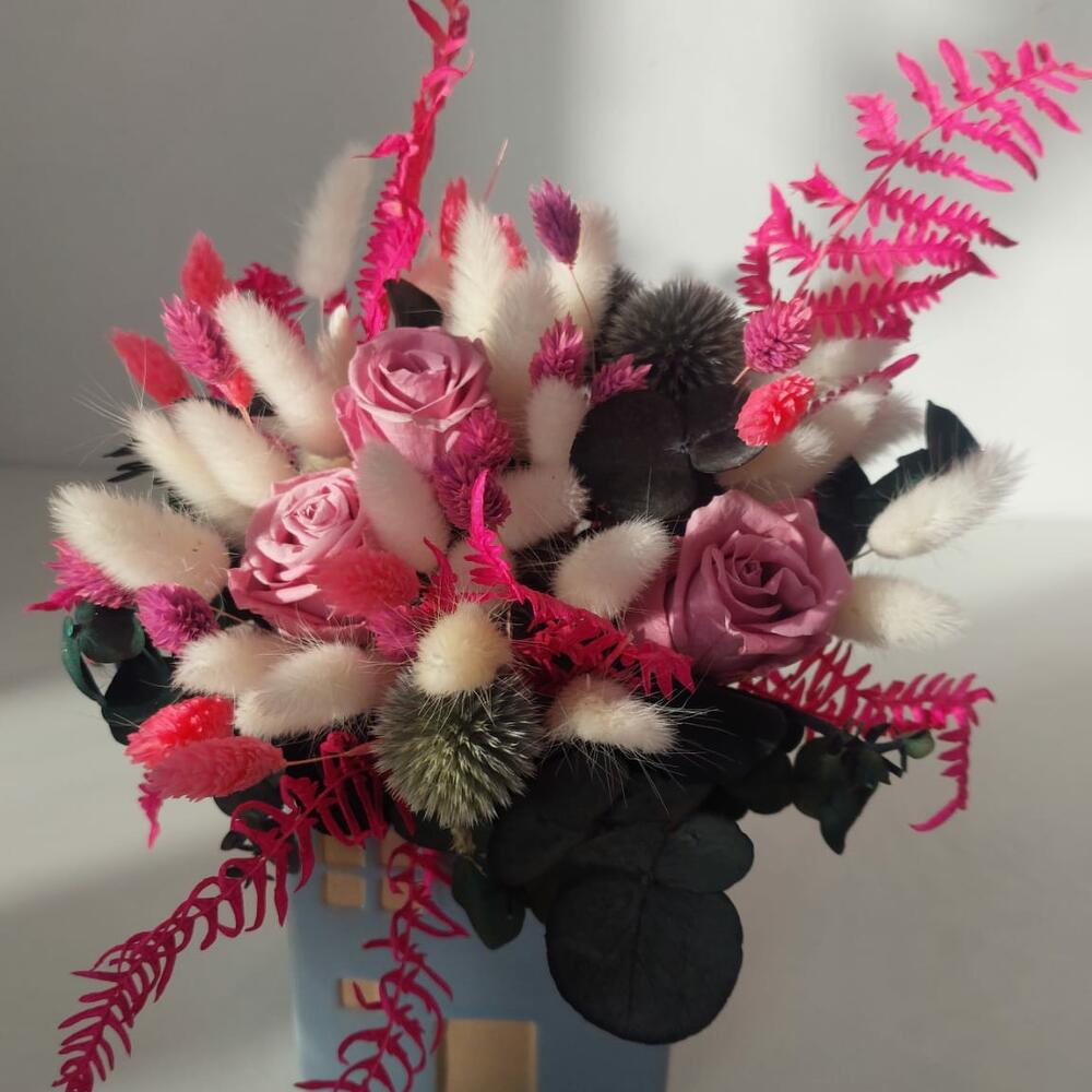 Häuschen mit stabilisierten Blumen - lange Haltbarkeit des ursprünglichen Aussehens 5-8 Jahre. Diese Komposition erhellt den Innenraum und wird an dich erinnern
