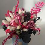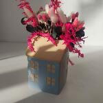 Hasenschwanzgras - 35 Stk. Eukalyptus - 4 Stk. stabilisierte Rose - 3 Stk. Keramikhaus - 1 Stk. Craspedia - 2 Stk. faliaris - 20 Stk. stabilisierter Farn - 8 Stk.
