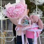 Satinband - 4 Stk. Hortensie rosa - 3 Stk. Hutschachtel Durchschnittliche - 1 Stk. Koreanische Verpackung - 3 Stk. Бумага тишью - 4 Stk. дополнительные материалы - 1 Stk. мини букет из гипсофилы - 1 Stk. зайчик розовый - 30 см - 1 Stk.