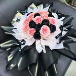 A striking contrast of blush pink and deep black roses, wrapped in sleek black and soft white layers, adorned with elegant black ribbons. This bold and captivating bouquet embodies mystery, passion, and sophistication, making it the ultimate statement piece for special occasions or declarations of love. The juxtaposition of soft hues and dramatic tones creates an unforgettable expression of timeless elegance and allure.
