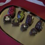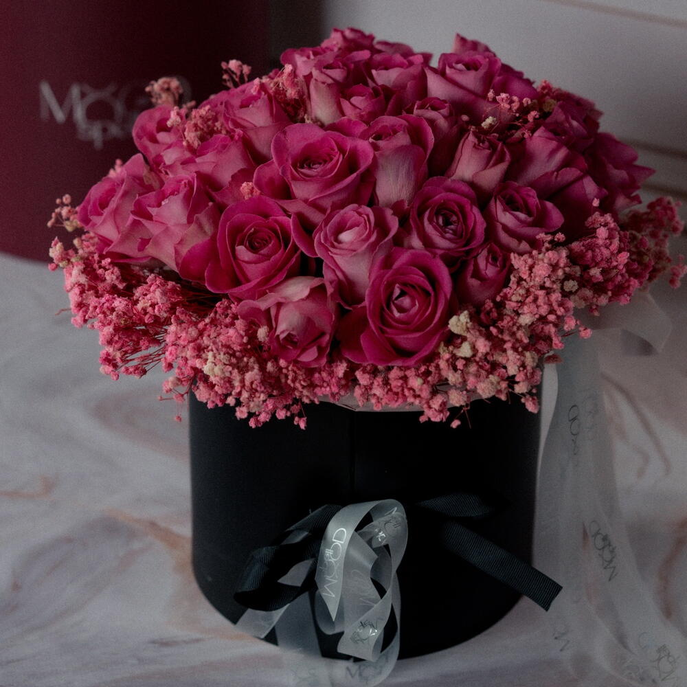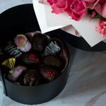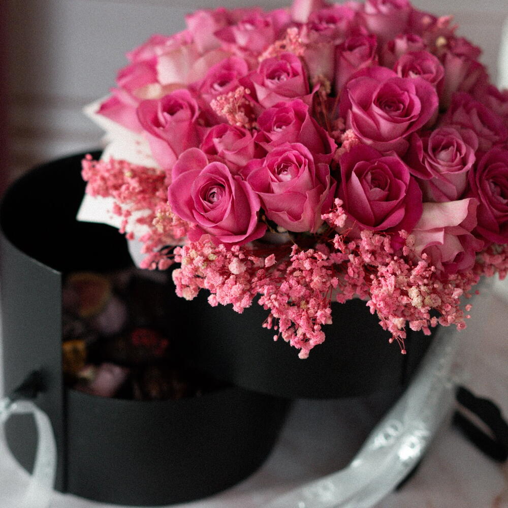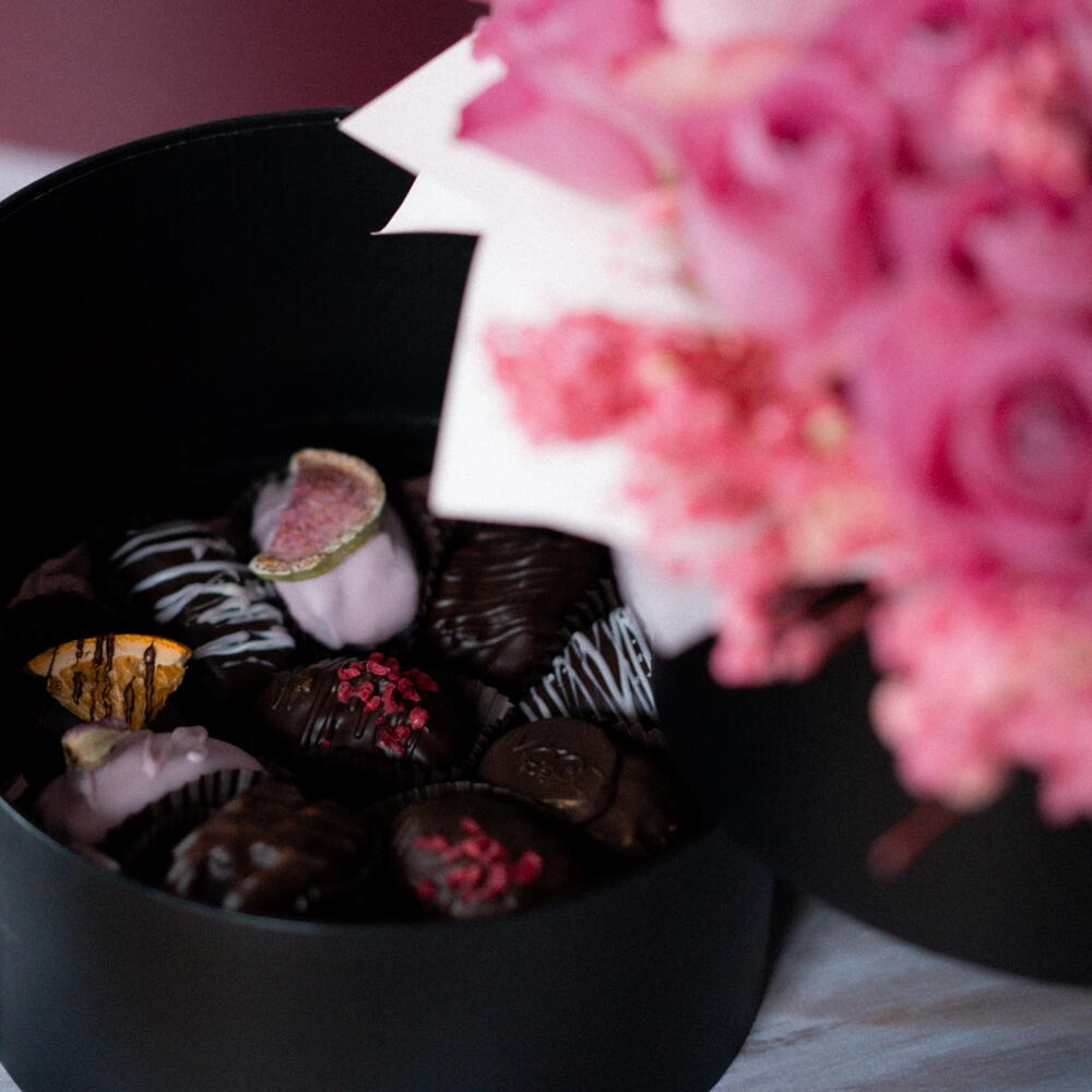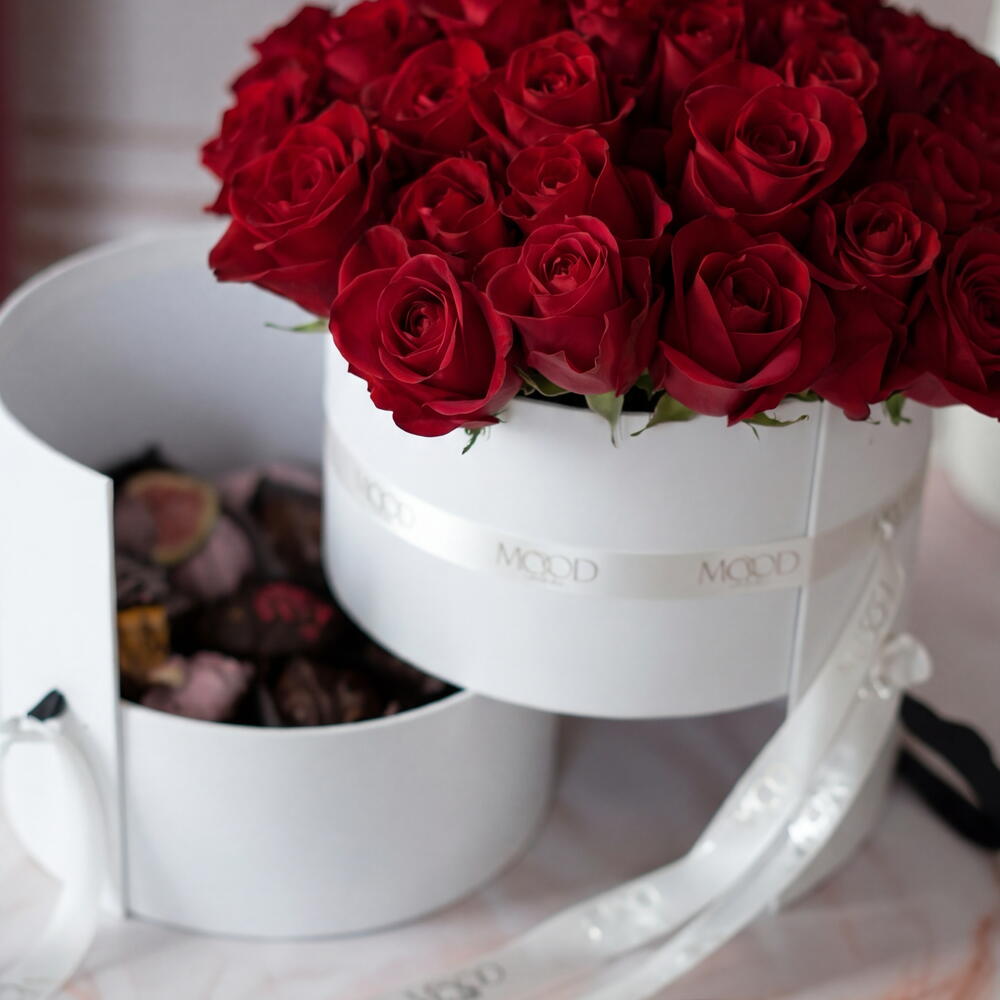Chocolate—covered dates with fillings - gift set with flowers An exquisite dessert that speaks for itself. Selected dates covered with natural Swiss chocolate, with a variety of fillings. Every taste is designed to surprise and be remembered. The set is decorated in an elegant gift box, contains 10 pieces (380gr) and complemented with a fresh floral arrangement ( 45 mini roses with gypsophila accents) — the perfect combination of taste and aesthetics. This gift requires no words and is suitable for special occasions.: a birthday, a date, a thank you, or just a nice gesture for no reason.