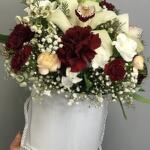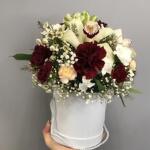 Blumen in einer Schachtel, gefertigt mit speziellem Floristikschaum. Eine hübsche, moderne Flowerbox ist ein schönes Geschenk für jeden Anlass. Möglichkeit, eine personalisierte Karte mit Widmung für die beschenkte Person hinzuzufügen. Zusammensetzung: Orchideen, Nelken, Alstroemerien, Schleierkraut, grüne Beiwerke.(17-19 Blumen)