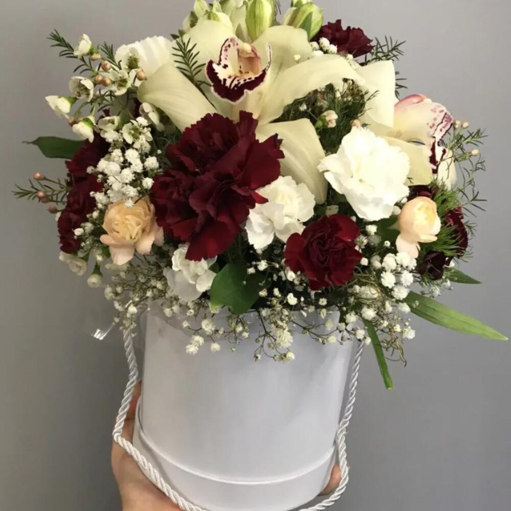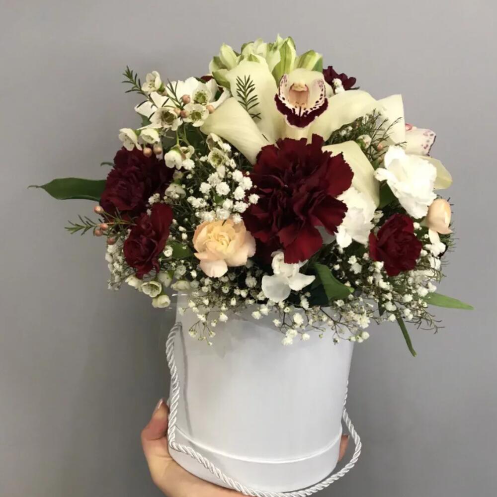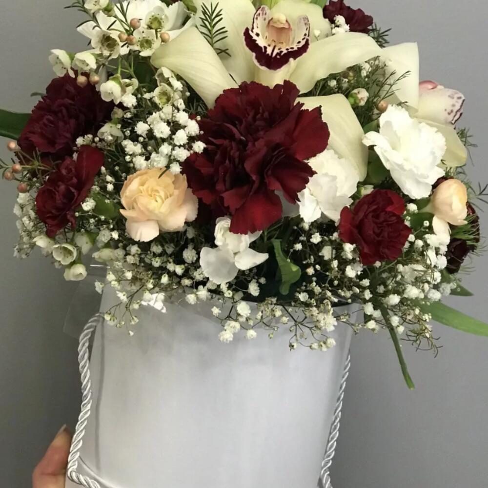 Blumen in einer Schachtel, gefertigt mit speziellem Floristikschaum. Eine hübsche, moderne Flowerbox ist ein schönes Geschenk für jeden Anlass. Möglichkeit, eine personalisierte Karte mit Widmung für die beschenkte Person hinzuzufügen. Zusammensetzung: Orchideen, Nelken, Alstroemerien, Schleierkraut, grüne Beiwerke.(17-19 Blumen)