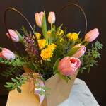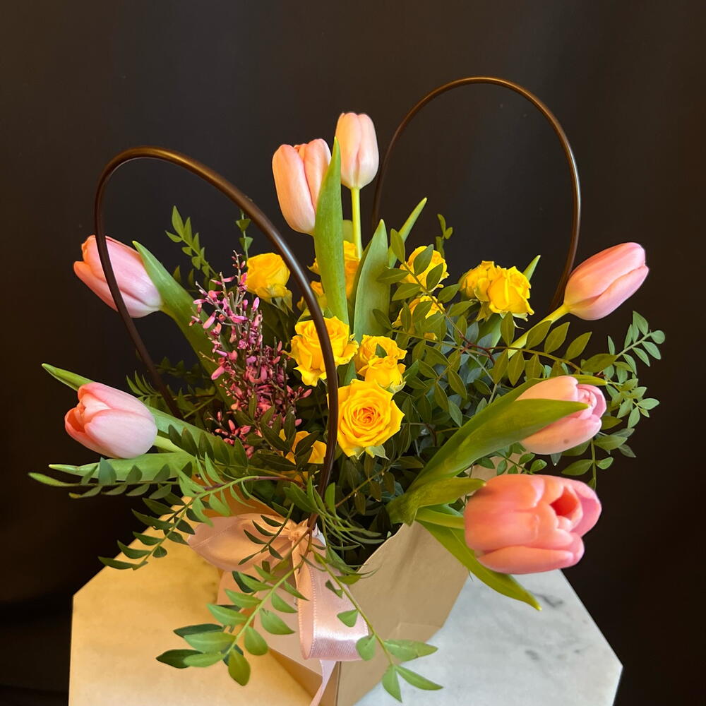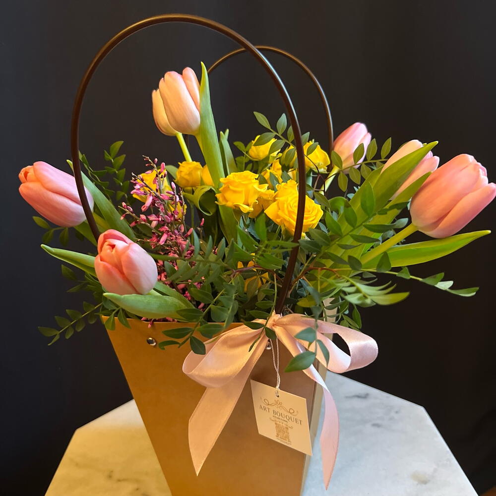 Flower gift in a bag with Tulips and Roses