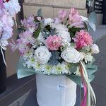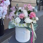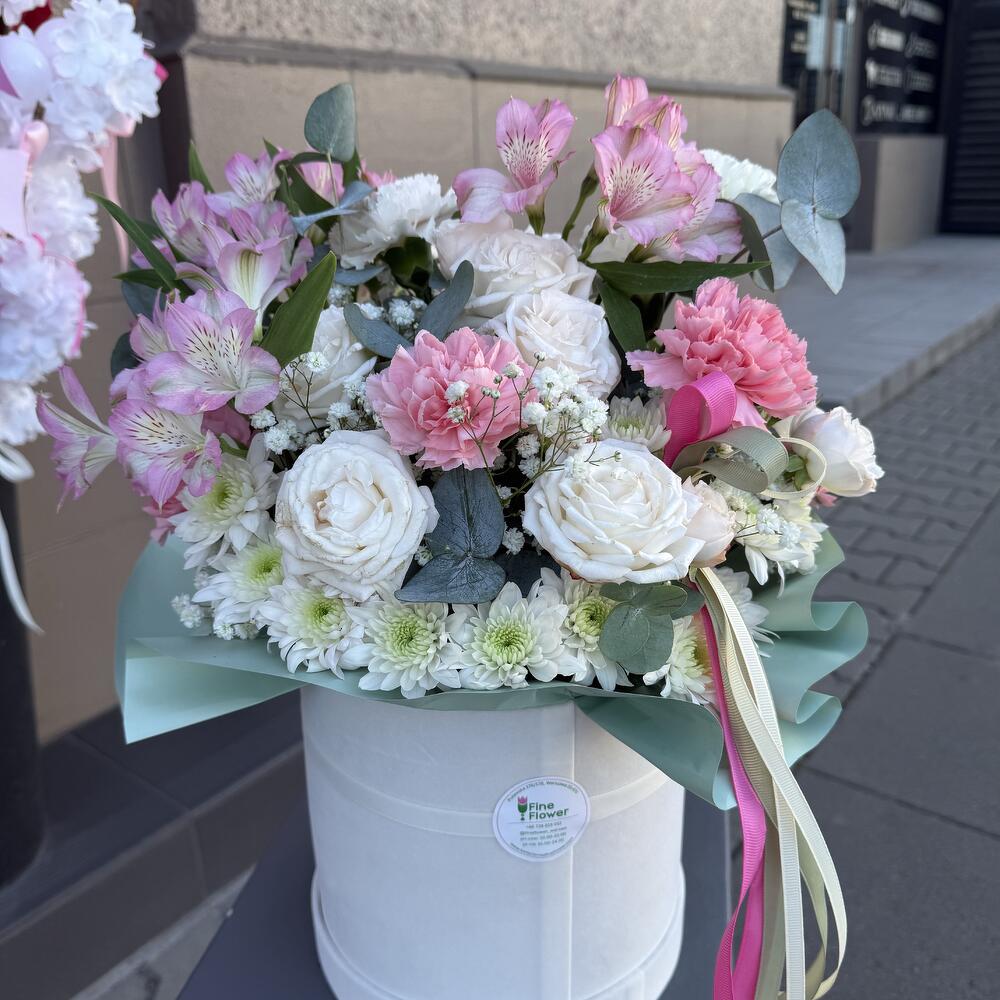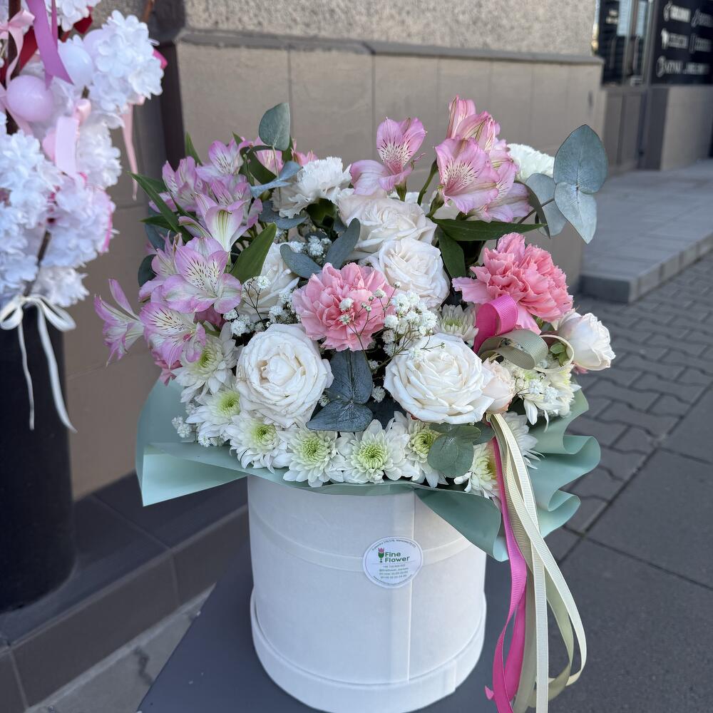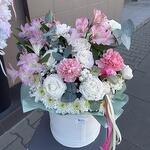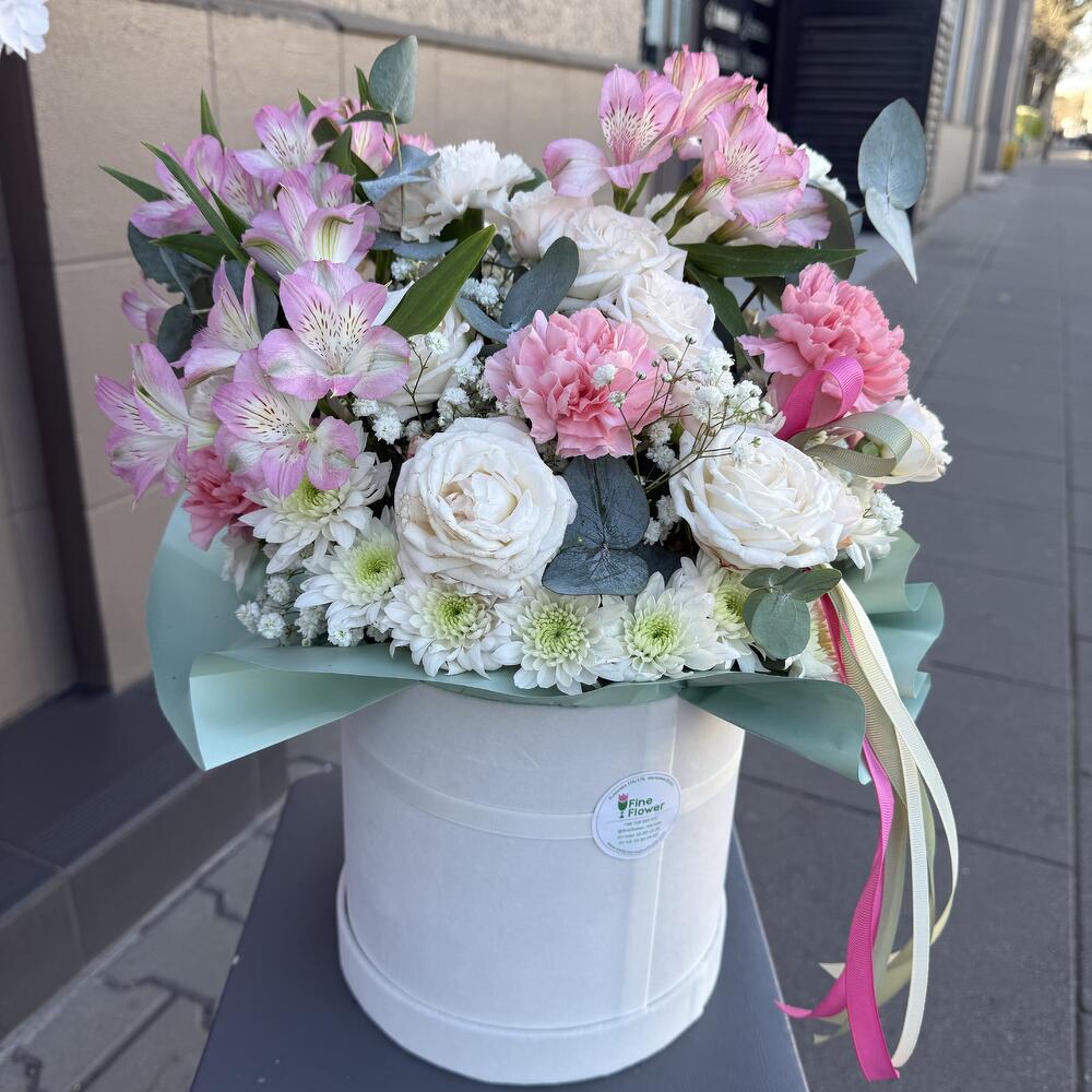 Eukalyptus - 3 Stk. Astromeria - 3 Stk. Spray-Rose - 1 Stk. Nelke - 9 Stk. Chrysantheme - 3 Stk. Schachtel - 1 Stk. schleierkraut - 1 Stk. Steckschaum - 2 Stk.