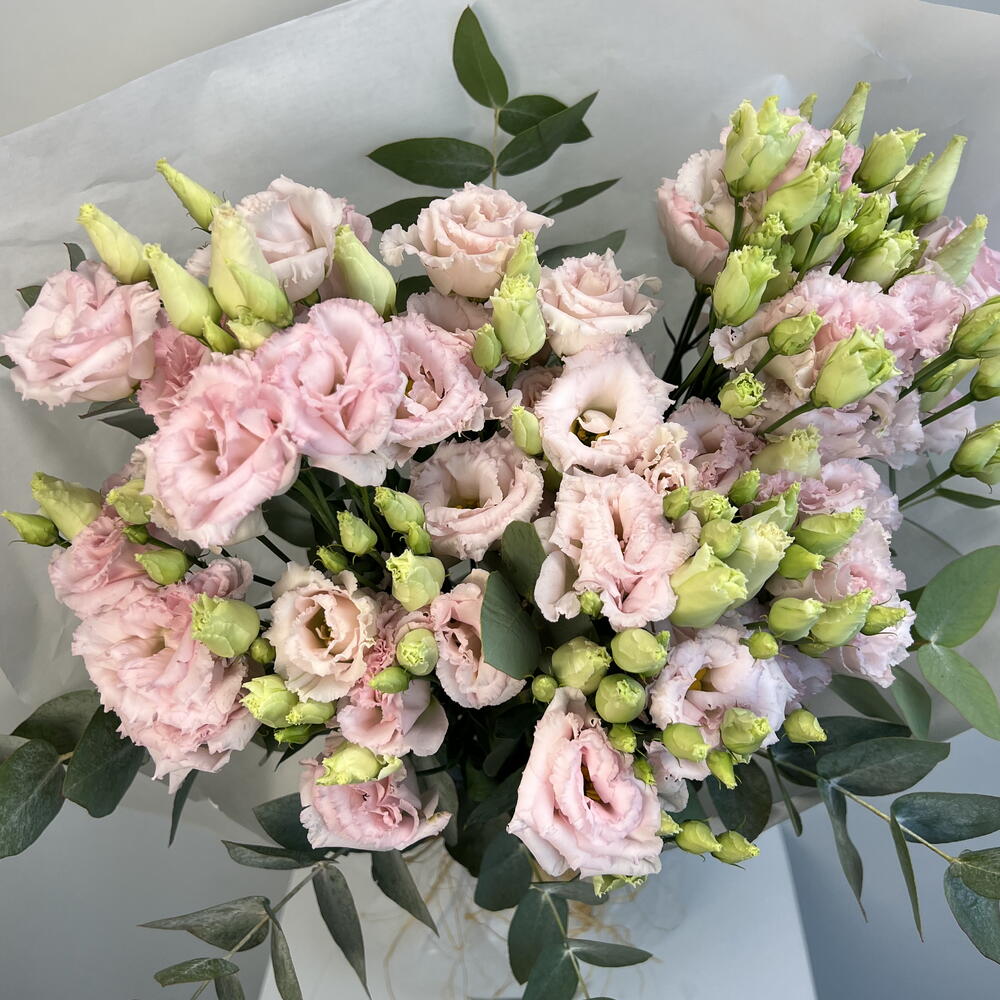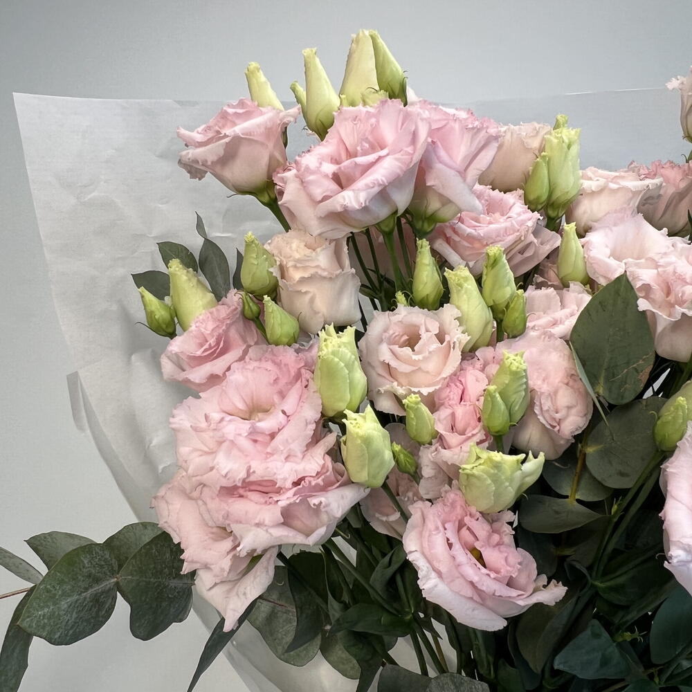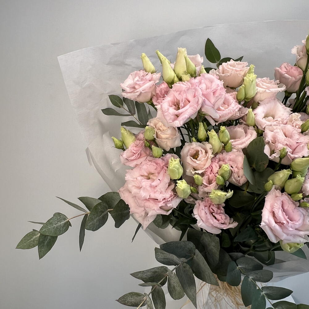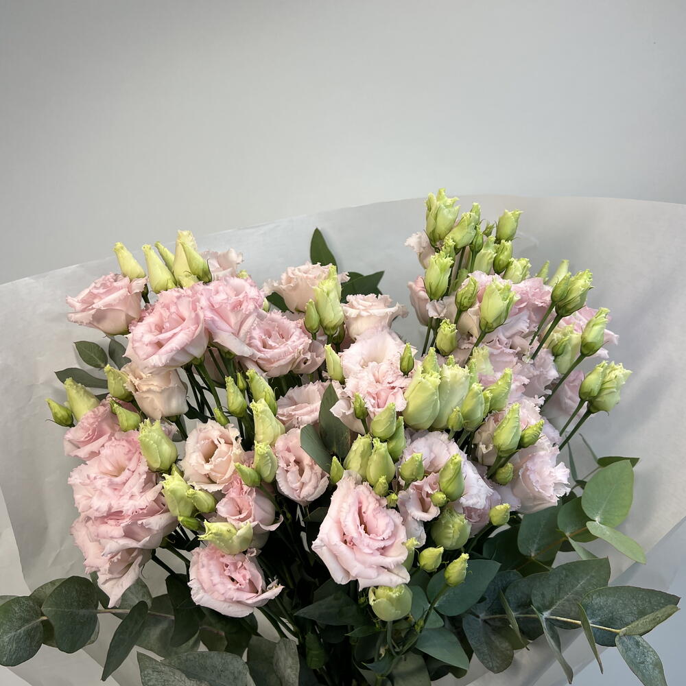Presenting a classy Mono Bouquet, curated with an aesthetic blend of 6 carefully selected Eucalyptus stems, 9 vibrant Lisianthus, and a combination of 15 beautifully composed Eucalyptus and Lisianthus together. Ideal for any occasion, this bouquet encapsulates charm, elegance and a breath of fresh nature. Bring it home to add a fresh touch to your space or present it as a thoughtful gift to a loved one.