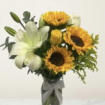 Bonito diseño elaborado en florero de vidrio, con Lili blanca, girasoles y rosas, acompañado de follajes de acuerdo al color diseño
