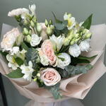 Eustoma - 2 Stk. Alstroemeria - 2 Stk. Rose - 5 Stk. Eukalyptus - 3 Stk. Freesie - 3 Stk. Nelke - 3 Stk.