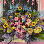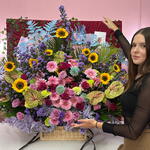 Basket - 1 Stk. monstera - 20 Stk. rose purple - 15 Stk. rosa Gerbera - 20 Stk. anthurium green - 20 Stk. leather leaf - 20 Stk. sunflowers stems - 15 Stk. aster mix - 20 Stk. peacock purple - 40 Stk. rose hot pink - 10 Stk. sedap malam - 20 Stk. gompie blue - 15 Stk. daun palm - 40 Stk. gompie green - 15 Stk.