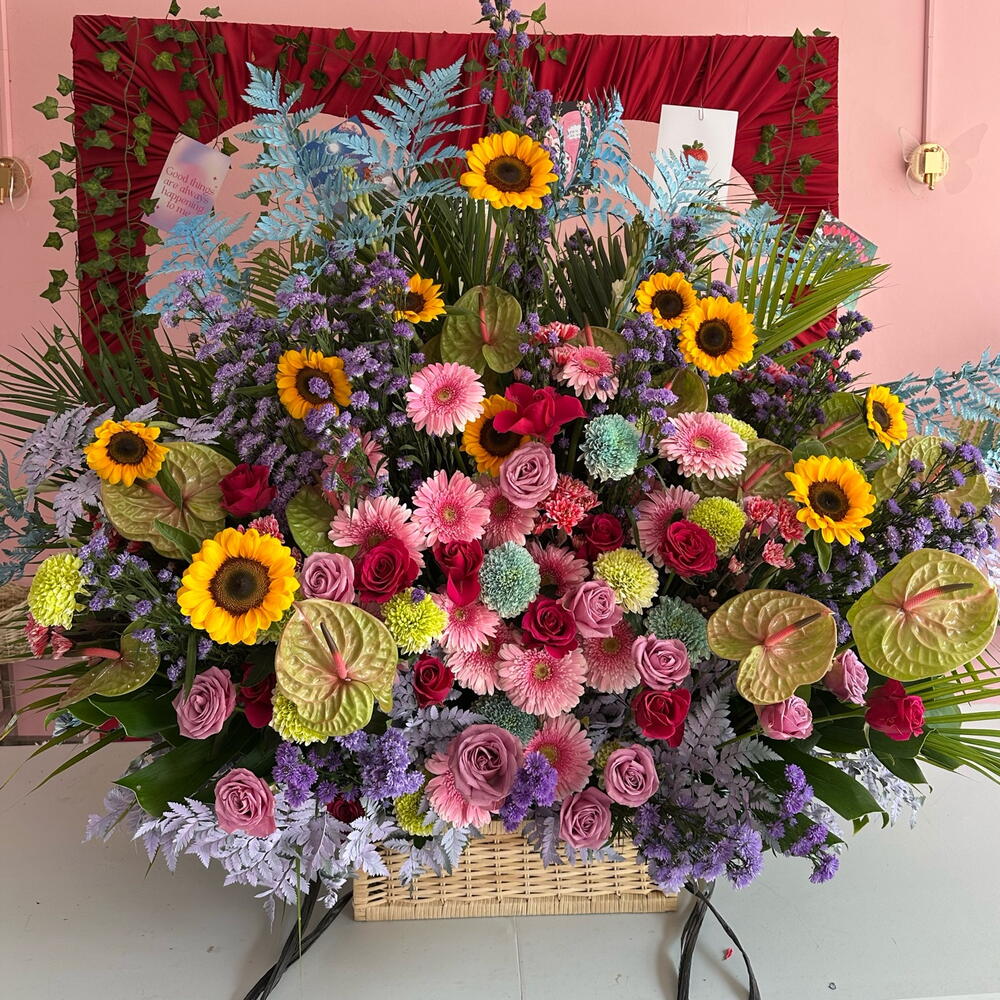 Basket - 1 Stk. monstera - 20 Stk. rose purple - 15 Stk. rosa Gerbera - 20 Stk. anthurium green - 20 Stk. leather leaf - 20 Stk. sunflowers stems - 15 Stk. aster mix - 20 Stk. peacock purple - 40 Stk. rose hot pink - 10 Stk. sedap malam - 20 Stk. gompie blue - 15 Stk. daun palm - 40 Stk. gompie green - 15 Stk.