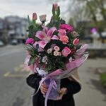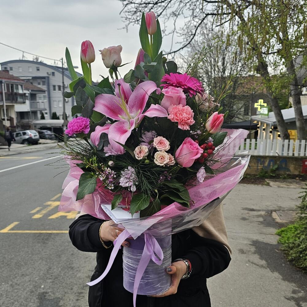 Greenery - 8 Stk. Sprayrose - 2 Stk. Box - 1 Stk. Gerbera - 2 Stk. dianthus - 2 Stk. roses - 4 Stk. seasonal mixed flower - 1 Stk. lilly oriental - 1 Stk. hiperium - 3 Stk.