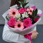 Ruscus - 2 Stk. Limonium - 1 Stk. Alstroemeria - 1 Stk. rose - 3 Stk. Mini-Gerbera - 3 Stk.