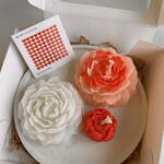 Подарочный набор включает: 1. Свечи «Розы» - 2 шт. 2. Свеча «маленький пион» 3. Круглая подставка