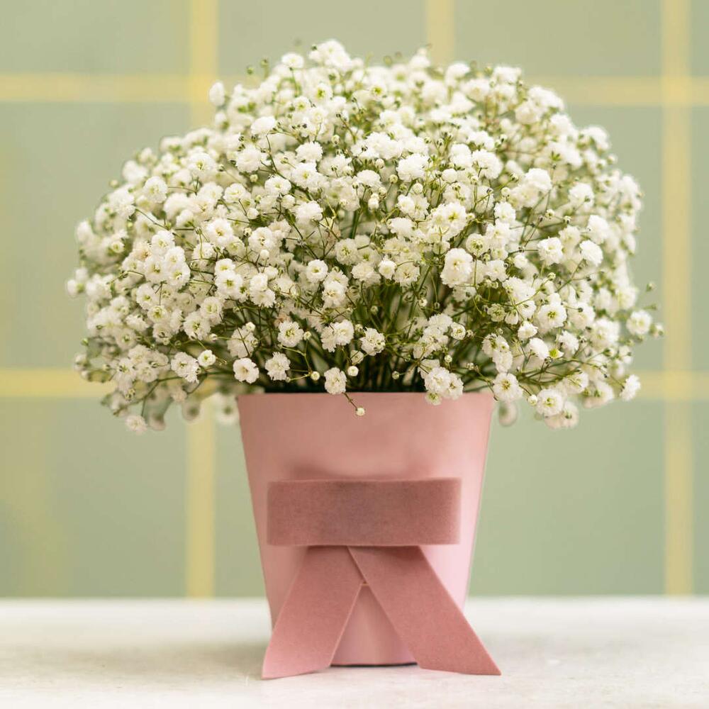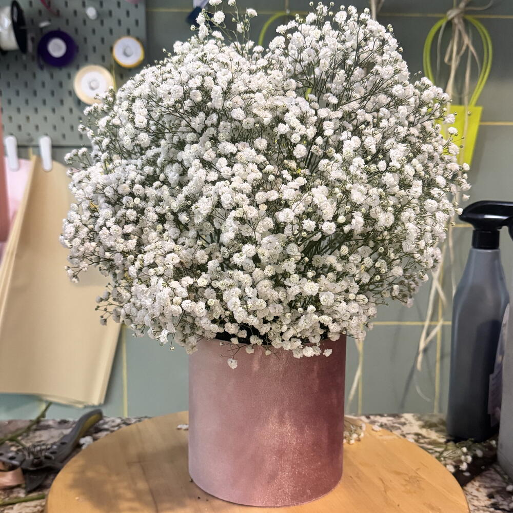 Immerse yourself in the charm of our uniquely selected Flower Crate, adorned with 7 delicate bunches of Gypsofila, beautifully nestled inside a single, elegantly designed Krabička. This simple, yet sophisticated arrangement promises to add a touch of elegance to any space, making it a perfect gift choice or a striking piece for your personal collection.
