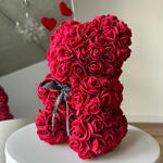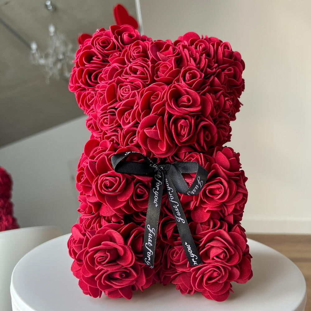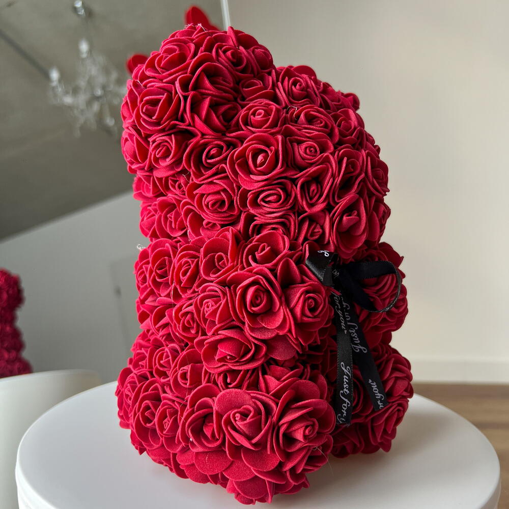 Größe Rosenbär: ca. 25 cm Farbe: weinrot inkl. Geschenkverpackung Ein wunderschönes und romantisches Geschenk für besondere Anlässe wie Valentinstag, Jahrestage, Geburtstage oder sogar als Geschenk zum Muttertag. Ein Rosenbär ist ein Stoffbär, der aus vielen kleinen Rosenblüten hergestellt wird. Ein Rosenbär ist ein Symbol der Liebe und Leidenschaft und ist eine perfekte Möglichkeit, um Ihre Gefühle und Emotionen auszudrücken. Er ist auch eine großartige Geschenkidee, wenn Sie etwas anderes als einen traditionellen Blumenstrauß verschenken möchten, da der Rosenbär eine langlebige Erinnerung an den besonderen Tag oder das Ereignis darstellt. Die Rosenbären wurden nach dem Klassischen Spielzeug „Teddy Bear“, das seit über 20 Jahren berühmt ist, erschaffen. Jeder Bär wird in Handarbeit aus mehr als 500 PE-Schaumstoff Rosen, die sehr angenehm anzufassen sind, erstellt. Ein Bärchen aus diesen Rosen hat es noch nicht geschafft zur Alltäglichkeit zu werden, deshalb wird Ihr Geschenk nicht nur das knuffigste, sondern auch das originellste und das markanteste. Bei Art Floral achten ganz besonders auf die Qualität. Dabei legen wir bei unseren Bären den Wert auf jede einzelne Blume. Die Form, die Dichte der Blumen, der feste Sitz jeder einzelner Blume sind drei wichtigste Kriterien. Ein Bärchen aus diesen Rosen hat es noch nicht geschafft zur Alltäglichkeit zu werden und ist deshalb ein Hingucker in jeder Alltäglichen Situation. Die Bärchen benötigen keine besondere Pflege, wir empfehlen keine direkte Sonneneinstrahlung, um das verblassen der Farben zu vermeiden. In diesem Fall wird der Bär über lange Jahre Freude bereiten. Zum Entstauben, den Bären einfach mit dem Fön abpusten. Sollte der unwahrscheinliche Fall eintreten, dass eine Blume abfällt, kann diese einfach mit einem Heißkleber wieder angeklebt werden.