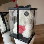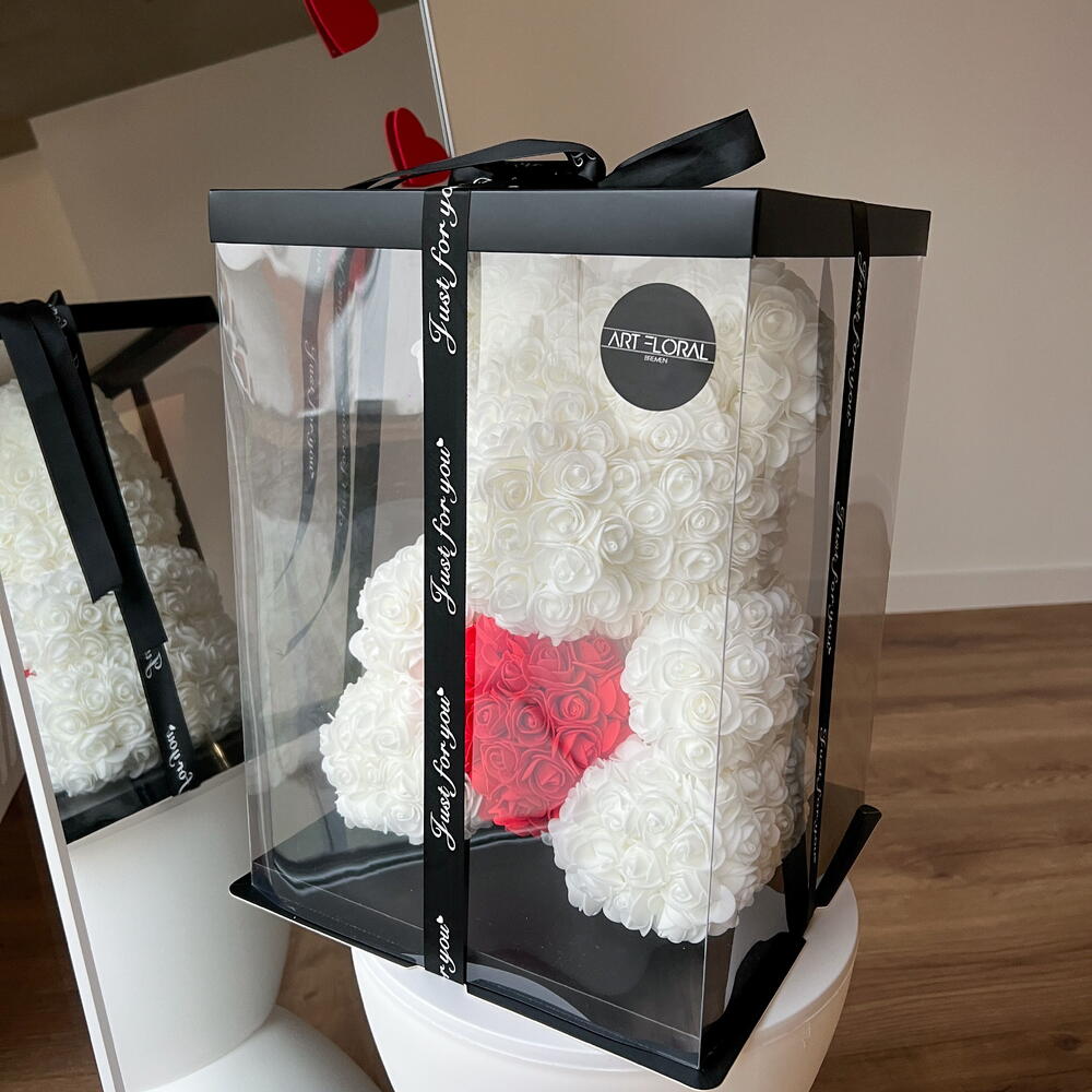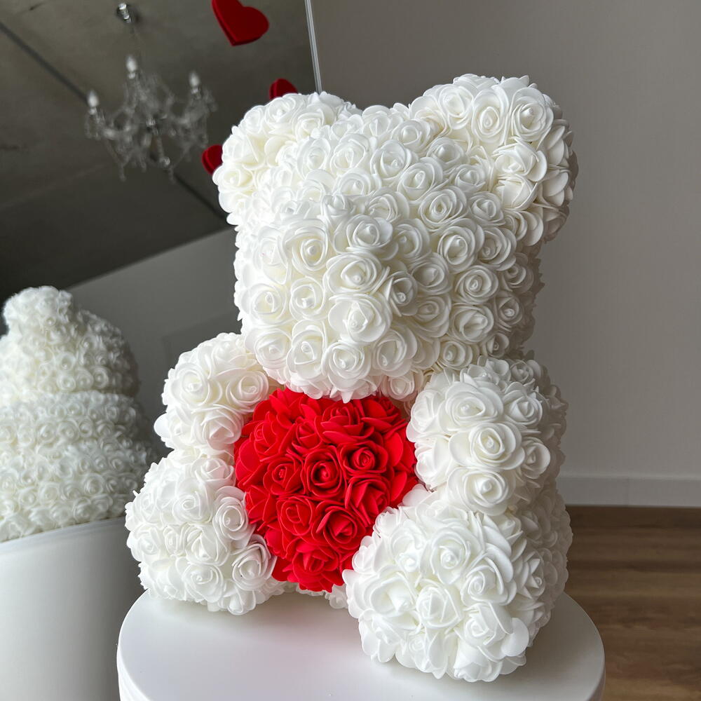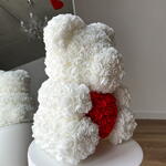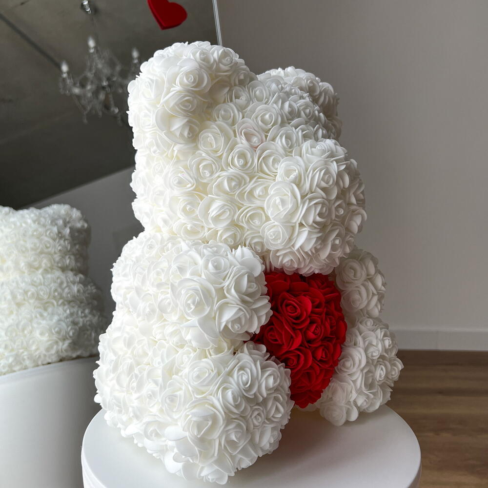 Rosenbär weiß mit Rosen Herz M Die Bärchen wurden nach dem Klassischen Spielzeug „Teddy Bear“, das seit über 20 Jahren berühmt ist, erschaffen. Jeder Bär wird in Handarbeit aus mehr als 500 PE-Schaumstoff Rosen, die sehr angenehm anzufassen sind, erstellt. Ein Bärchen aus diesen Rosen hat es noch nicht geschafft zur Alltäglichkeit zu werden, deshalb wird Ihr Geschenk nicht nur das knuffigste, sondern auch das originellste und das markanteste. Bei Art Floral achten ganz besonders auf die Qualität. Dabei legen wir bei unseren Bären den Wert auf jede einzelne Blume. Die Form, die Dichte der Blumen, der feste Sitz jeder einzelner Blume sind drei wichtigste Kriterien. Ein Bärchen aus diesen Rosen hat es noch nicht geschafft zur Alltäglichkeit zu werden und ist deshalb ein Hingucker in jeder Alltäglichen Situation. Die Bärchen benötigen keine besondere Pflege, wir empfehlen keine direkte Sonneneinstrahlung, um das verblassen der Farben zu vermeiden. In diesem Fall wird der Bär über lange Jahre Freude bereiten. Zum Entstauben, den Bären einfach mit dem Fön abpusten. Sollte der unwahrscheinliche Fall eintreten, dass eine Blume abfällt, kann diese einfach mit einem Heißkleber wieder angeklebt werden. Jetzt bequem bestellen und an die gewünschte Adresse liefern lassen.
