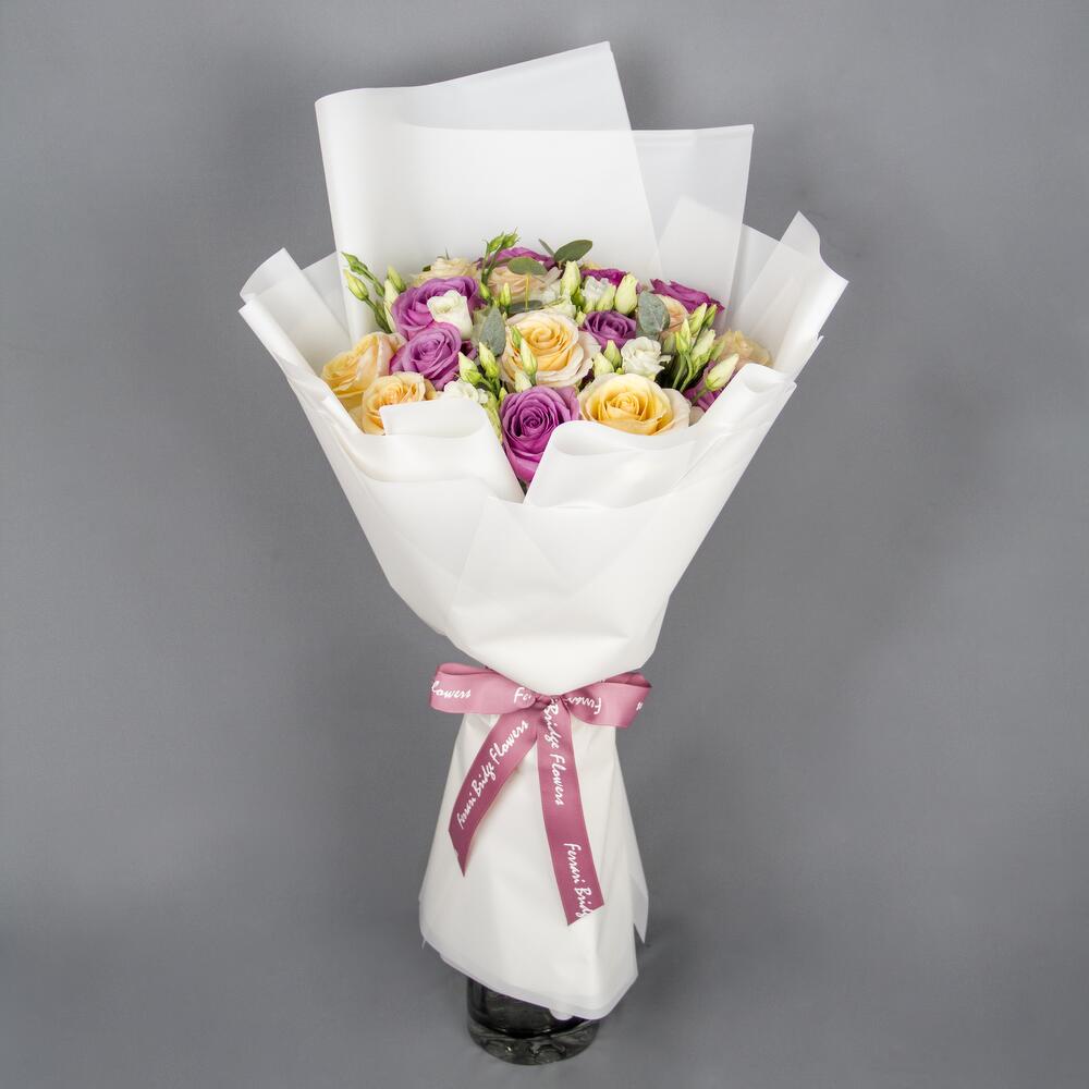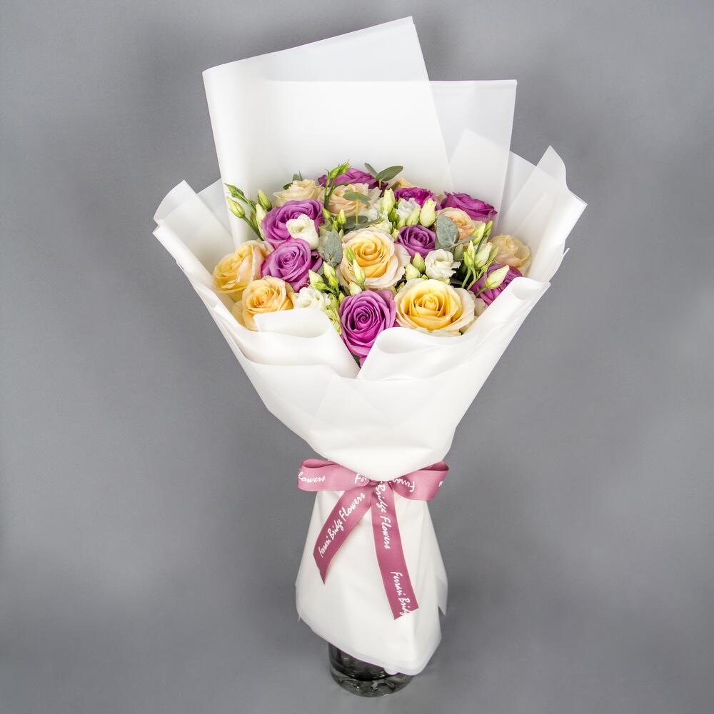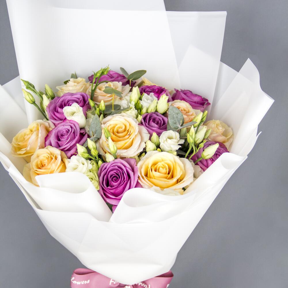 Ribbon - 1 Stk. Eustoma - 5 Stk. Eucalyptus - 2 Stk. Wrapping - 5 Stk. rose - 17 Stk.