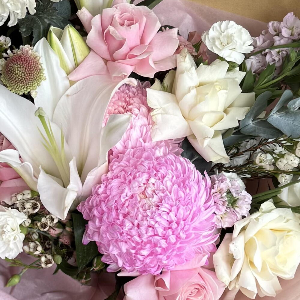 Eucalyptus - 2 Stk. Lilies - 3 Stk. carnations - 5 Stk. rose - 3 Stk. Chrysanthemen - 3 Stk. spraynelken - 2 Stk. peony mom - 1 Stk. waxflower - 2 Stk.