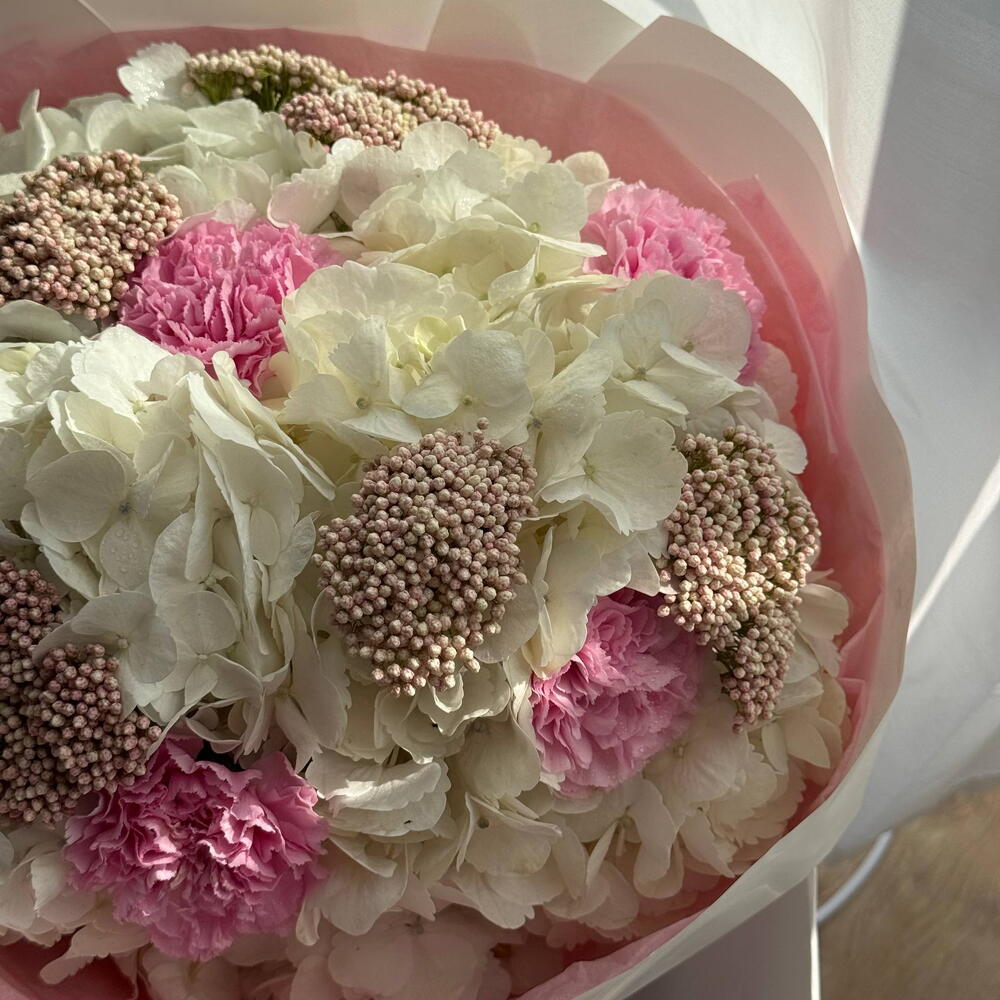 Zarter Strauß in Weiß- und Rosatönen aus Hortensien, Ozothamnus und Nelken. Leicht, romantisch und elegant — ideal für jeden Anlass.