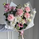 Verbandshrysantheme, nadelfoermig - 1 Stk. Eukalyptus - 3 Stk. Eustoma - 2 Stk. Диантус - 5 Stk. Матрикария - 2 Stk.