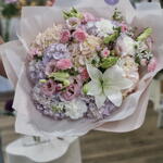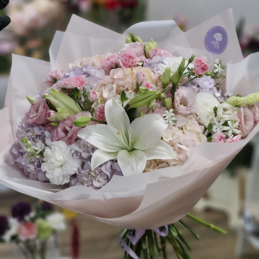 Delicie-se com a elegância do nosso bouquet Autoral, composto por três fascinantes Eustomas, nove luxuosas Hortênsias e duas delicadas Lírios. Adornado ainda com dez vibrantes Cravos, este magnífico arranjo floral é capaz de abrilhantar qualquer ambiente com a sua beleza natural e o seu sofisticado charme.
