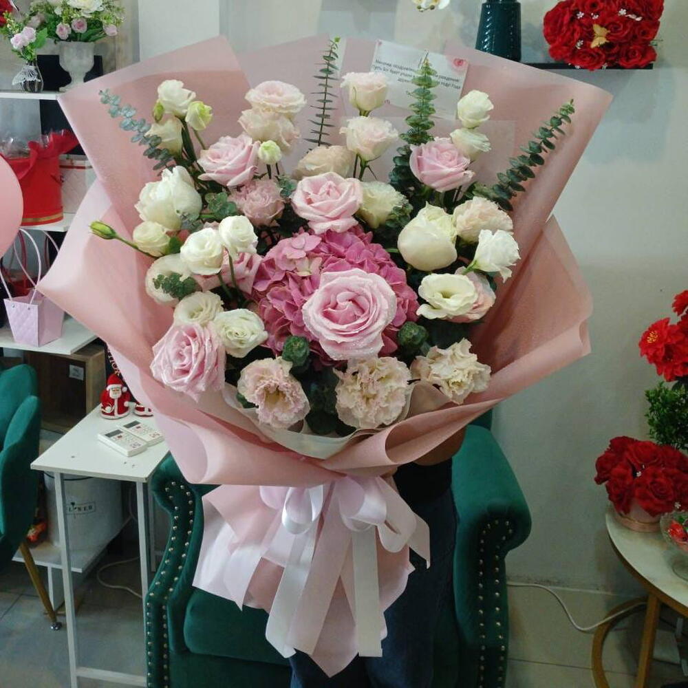 A delicate bouquet in powdery tones, composed of graceful roses, airy hydrangeas, and refined accents. The arrangement is light and romantic, evoking a feeling of warmth, care, and sincere feelings. Perfect for a declaration of love, a gift to a loved one, or a special occasion when you want to say more than words can.
