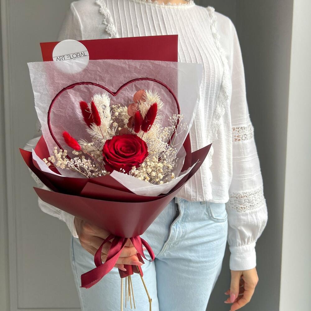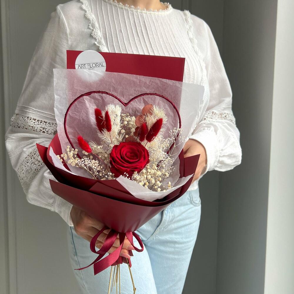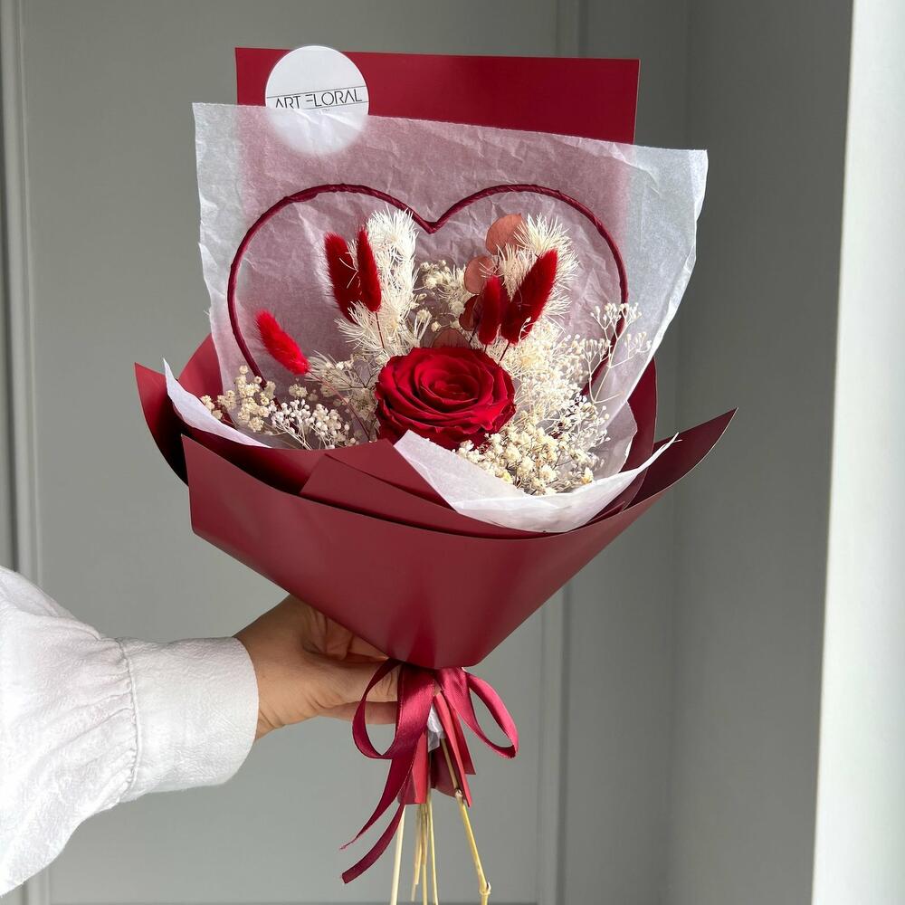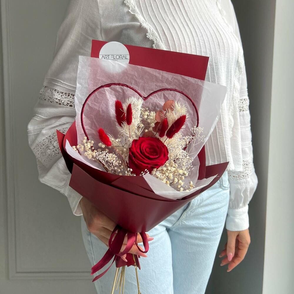Trockenblumenstrauß Tief im Herzen Der Trockenblumenstrauß „Tief im Herzen“ bringt Gefühle auf den Punkt – stilvoll, elegant und mit einem Hauch Ewigkeit. Eine einzige tiefrote Infinity-Rose steht im Mittelpunkt dieses handgebundenen Herz-Bouquets und wird liebevoll ergänzt durch feine Trockenblumen wie Lagurus, Schleierkraut und zartes Farn. Dieses kompakte, aber bedeutungsvolle Arrangement ist die perfekte Botschaft für jeden Herzensmenschen – ob zum Muttertag, zum Geburtstag, für die beste Freundin oder einfach, um Danke zu sagen. Dank der konservierten Blume bleibt die Schönheit dieses Straußes über viele Monate hinweg erhalten – ein Geschenk, das von Dauer ist und immer wieder berührt. Die Erstellung jedes Arrangements erfolgt individuell mit viel Leidenschaft für unser Handwerk und somit ist auch jeder Strauß ein Einzelstück und kann etwas von Abbildungen abweichen. Es handelt sich um ein Naturprodukt, dadurch sind naturbedingte Abweichungen in der Form, Farbe oder Größe zu den Angaben möglich! Die Produktionszeit bis wir die Sendung in den Versand geben können, kann bis zu 10 Werktage betragen. Darum bitten wir um möglichst eine vorzeitige Bestellung! Um die Farbintensität des Trockenblumen-Bouquets mehrere Jahre aufrecht zu erhalten, sollten die Blumen nicht der direkten Sonneneinstrahlung ausgesetzt werden. Unsere Trockenblüten wurden einem aufwendigen Trocknungs- und Konservierungsverfahren bzw. einer Bleichung oder Färbung unterzogen , dadurch hält der getrocknete Blumenstrauß bei der richtigen Pflege eine sehr lange Zeit und strahlt eine schöne Farbintensität aus. Individuelle Anfragen nehmen wir sehr gerne entgegen, dazu einfach eines unserer vielen Kontaktmöglichkeiten nutzen.