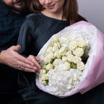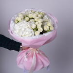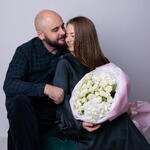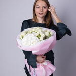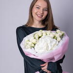 Букет красивый получился. Доставили немного позже назначенного времени, не критично для нас это было. Фото отчет сделали быстро. Доставка считаю дорогая, плюс большие розы не первой свежести были.