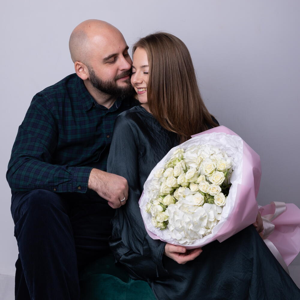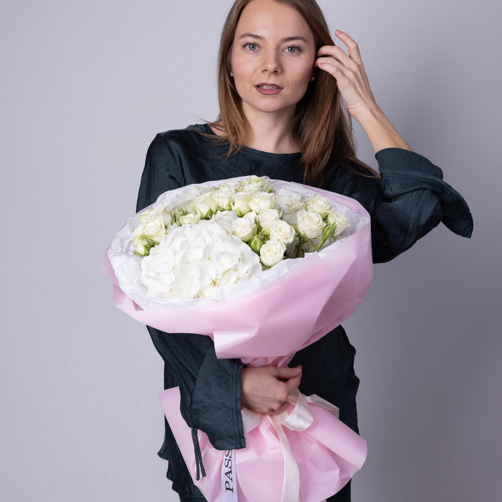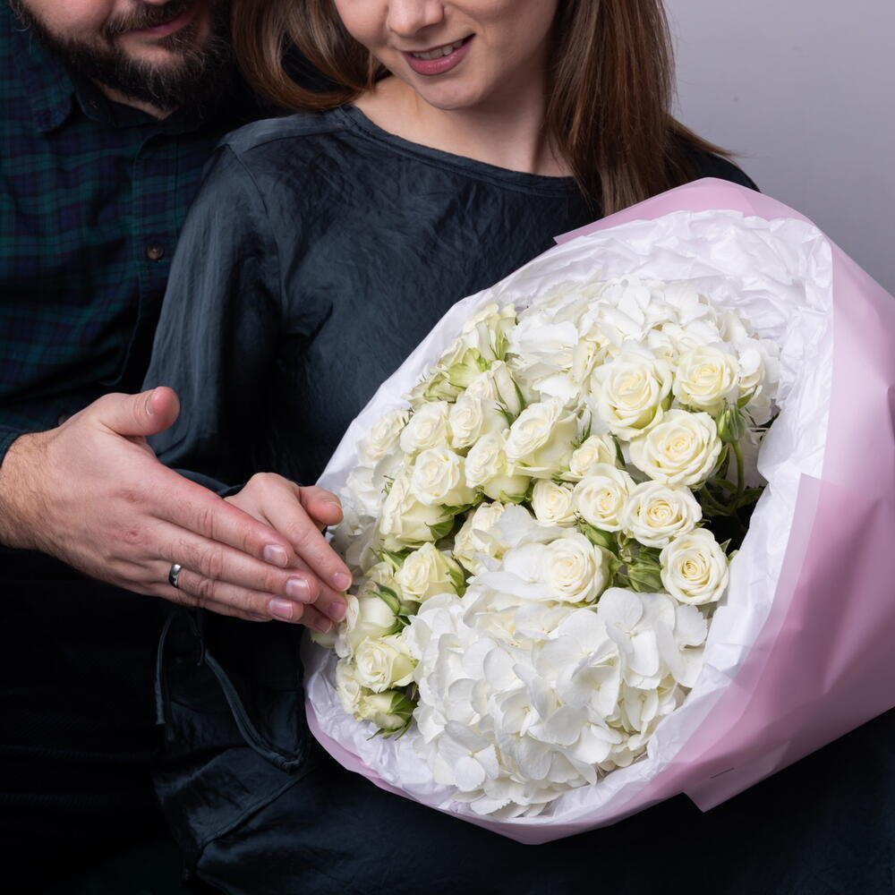 Weißer „Ich liebe dich“-Strauß (weiße Sprayrosen, weiße Hortensie)