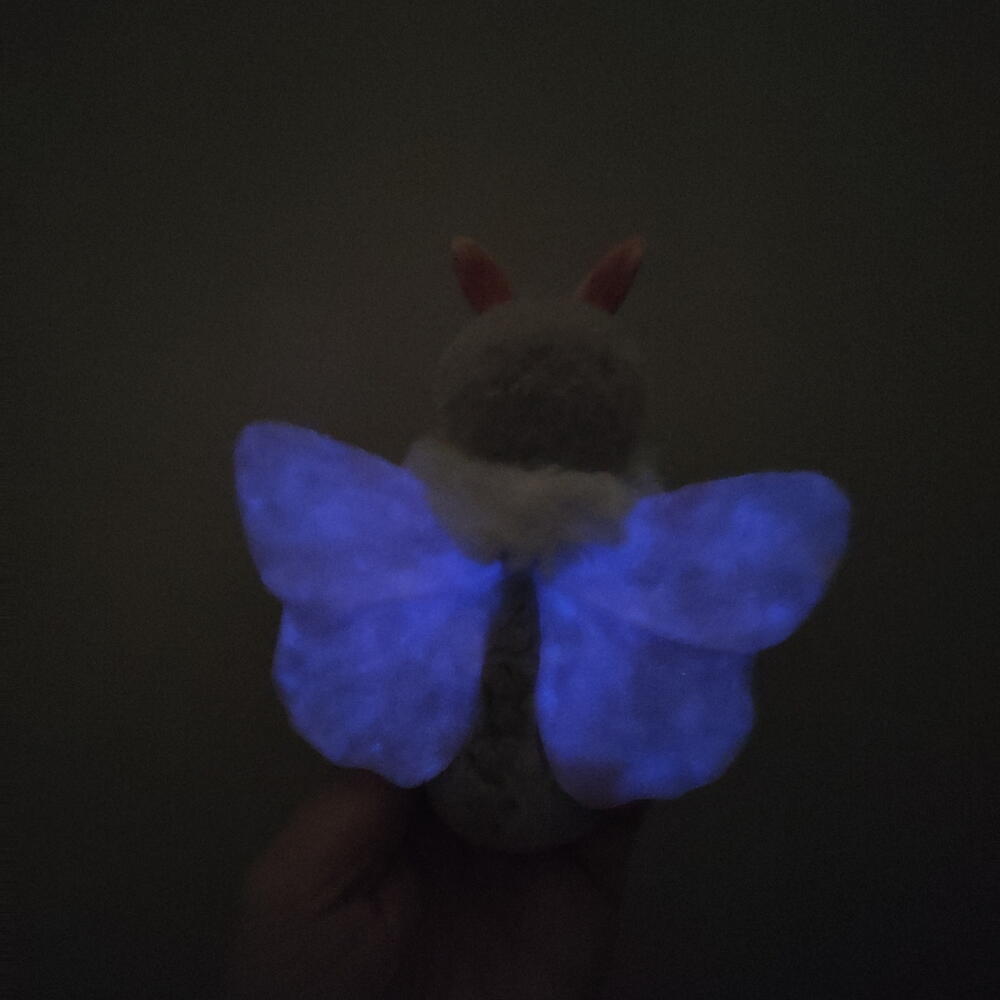 Interior toy, not intended for children. Made of artificial fur and polymer clay, paws move. Fragile, do not injure! if you fill it well with light the wings glow a little blue in the dark