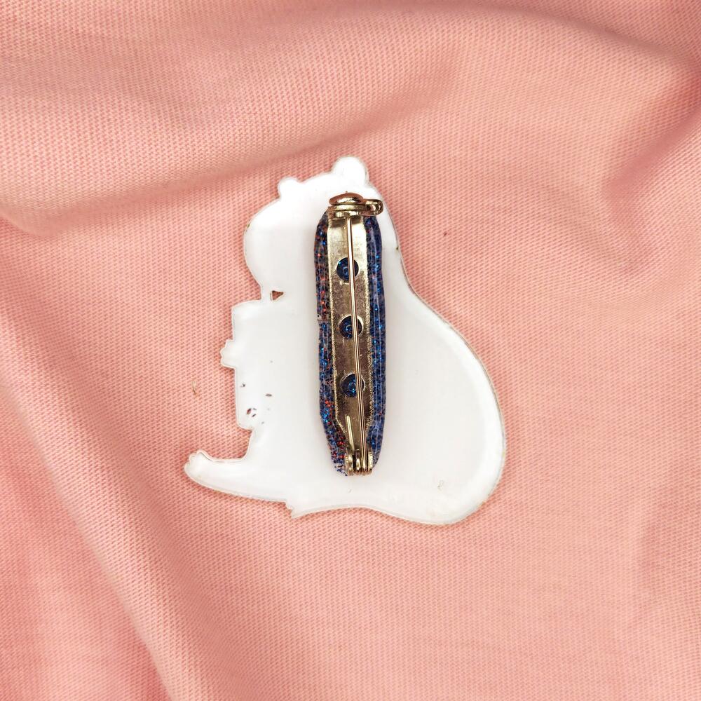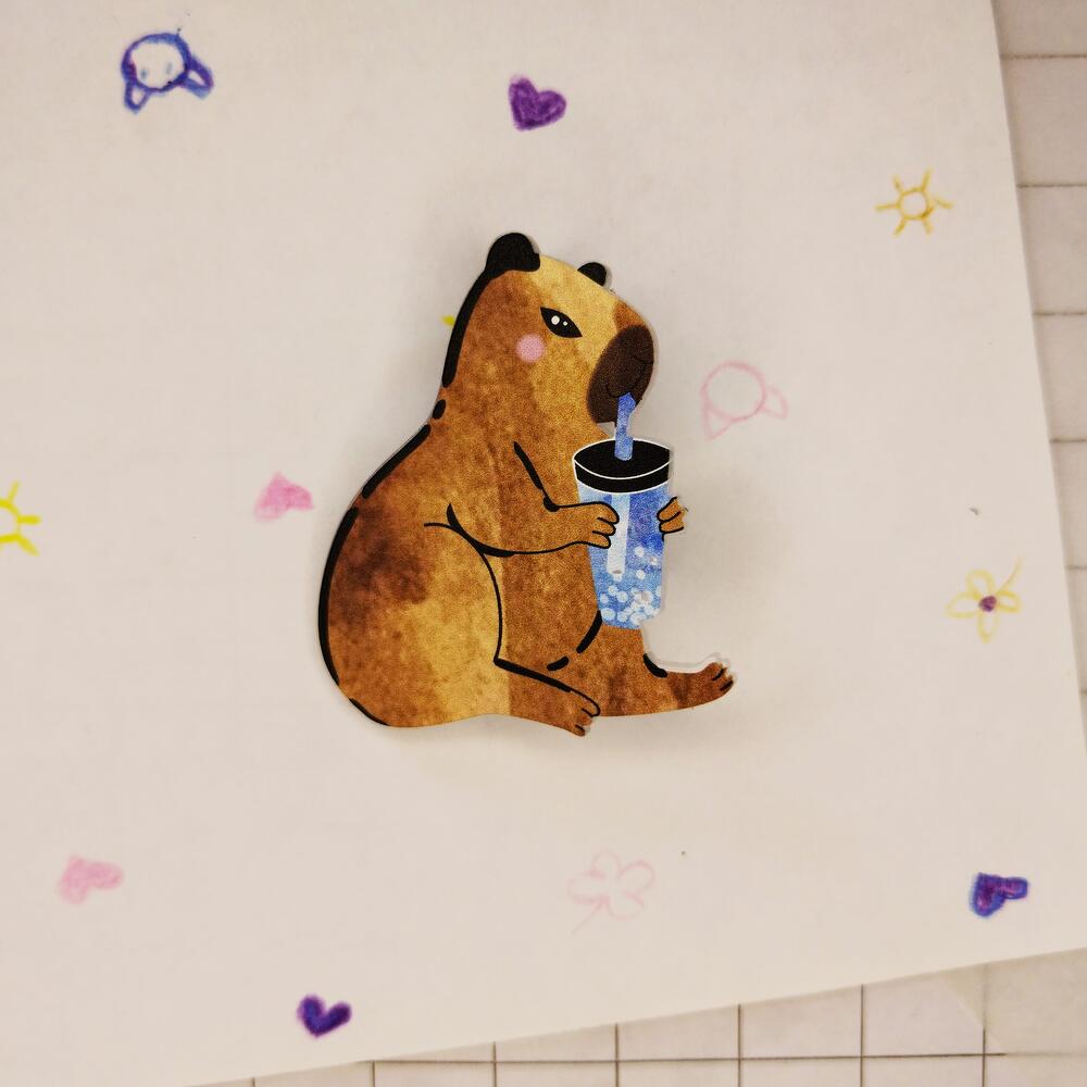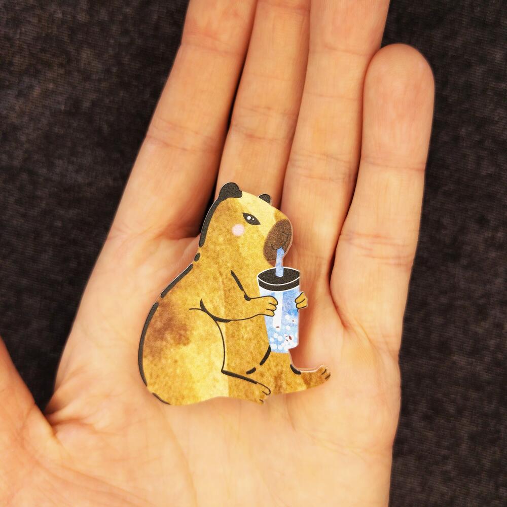 A cute capybara pin holding a bubble tea cup. Made from recycled plastic using waterproof UV printing. The brooch features a locking clasp, making it safe for children and reducing the risk of loss. Size: 40 x 45 mm.