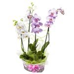 Greenery - 5 Stk. Basket - 1 Stk. Phalaenopsis orchid white 2 stems - 1 Stk. Phalaenopsis orchid pink 2 stems - 1 Stk. Pink ribbon - 1 Stk.